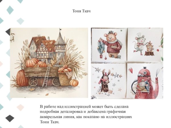 Тоня Ткач - талантливый и креативный иллюстратор, чьи работы поражают своей оригинальностью и качеством исполнения. Ее иллюстрации являются настоящим произведением искусства, в которых каждая деталь продумана до мельчайших нюансов. Благодаря своему уникальному стилю, Тоня создает яркие и запоминающиеся образы, которые притягивают взгляд и заставляют задуматься. В ее работах можно увидеть гармоничное сочетание цветов, фантастических элементов и умело переданную эмоциональность. Будь то иллюстрации для книг, журналов, рекламных материалов или арт-проектов, Тоня Ткач всегда создает нечто уникальное и особенное.