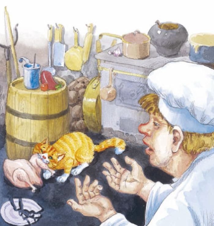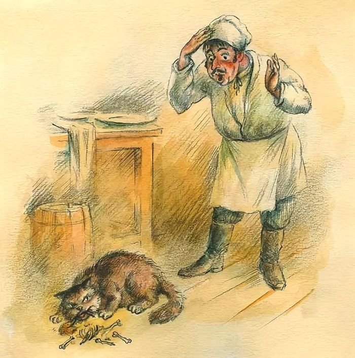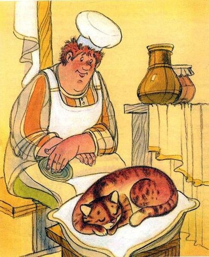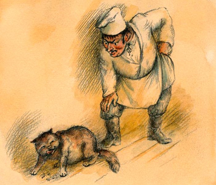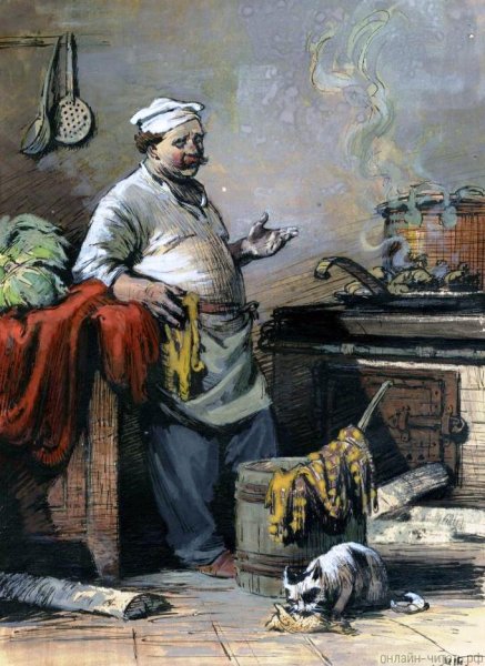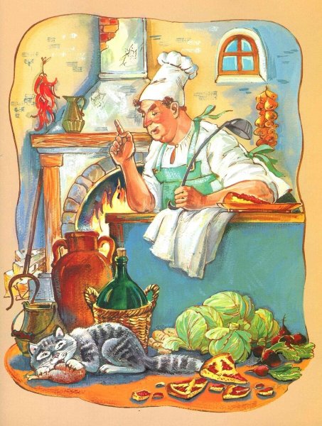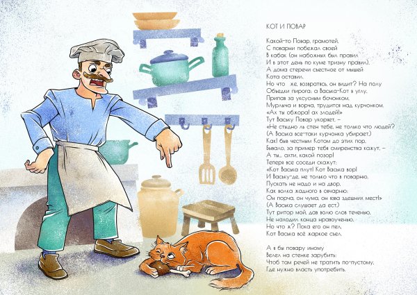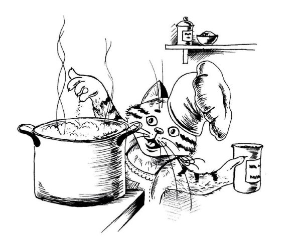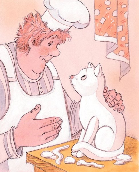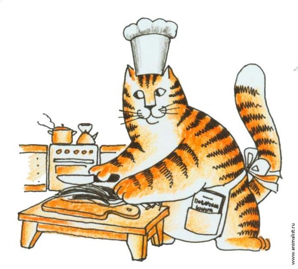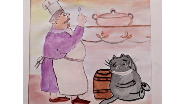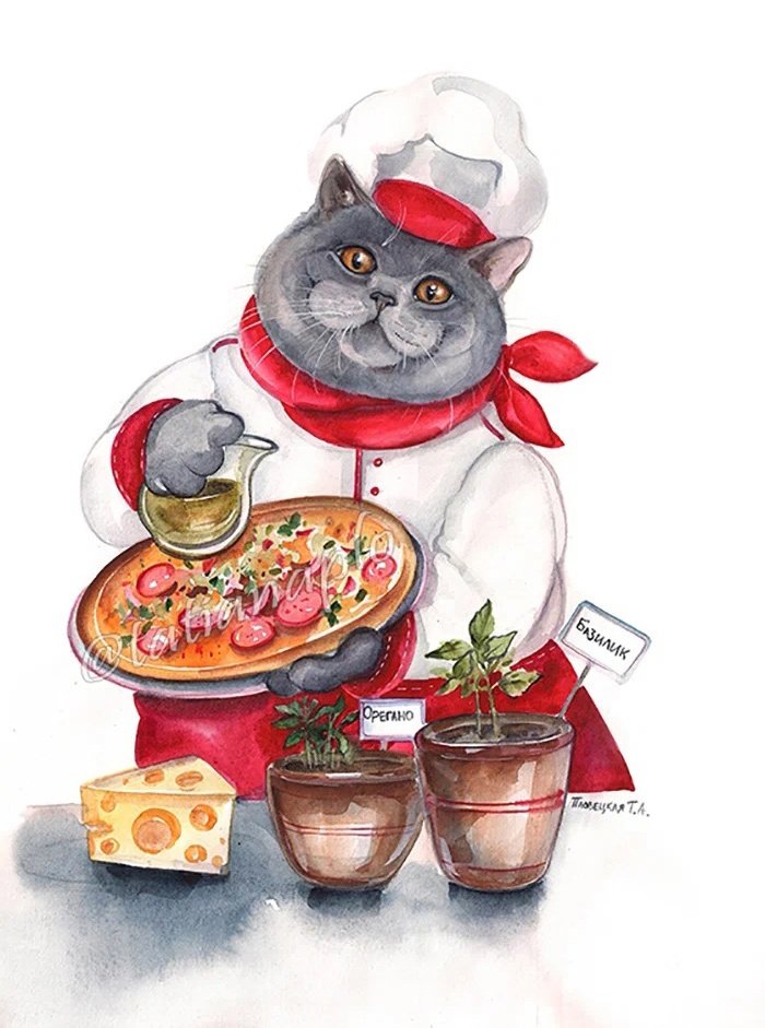 Эта яркая иллюстрация показывает веселую сцену, где кошка и повар находятся рядом. Кот подвинулся поближе к повару, который серьезно занят приготовлением блюда. Он стоит перед огромной деревянной доской, на которой лежат разные ингредиенты и кухонные принадлежности. Кот с любопытством наблюдает за каждым движением повара, будто хочет помочь ему или узнать секреты его искусства. Их взаимодействие создает атмосферу радости и веселья, а также подчеркивает связь между домашними животными и людьми. Это иллюстрация может использоваться для книги о кулинарии или быть частью коллекции живописи, чтобы добавить жизни и тепла в любое помещение.