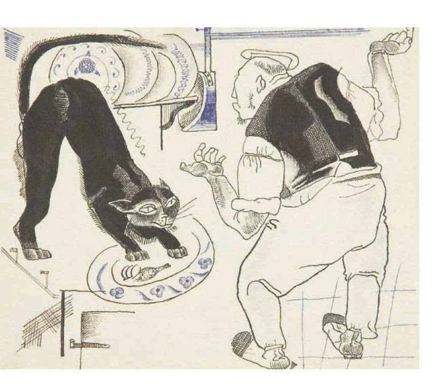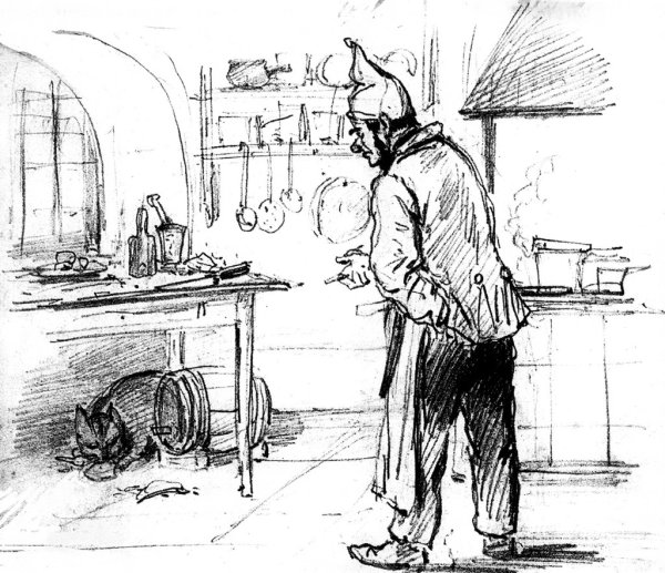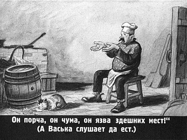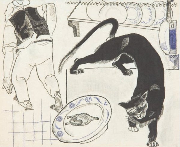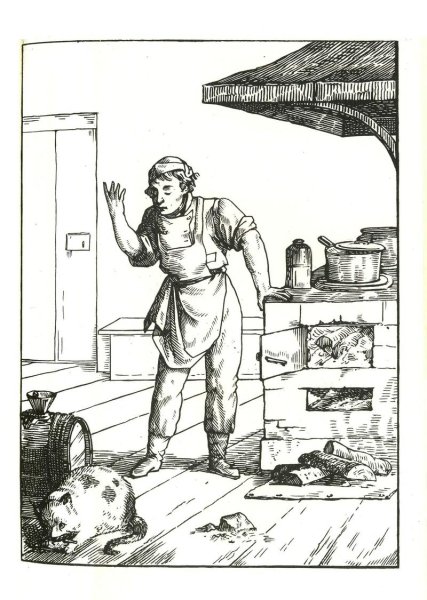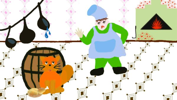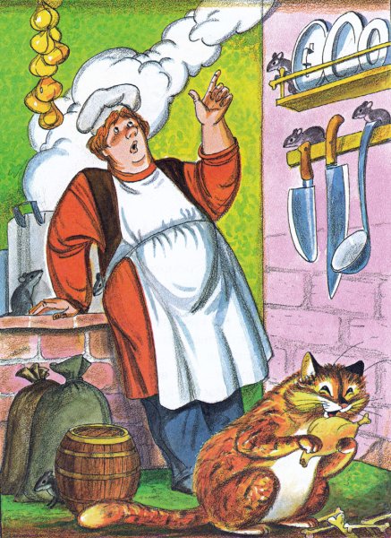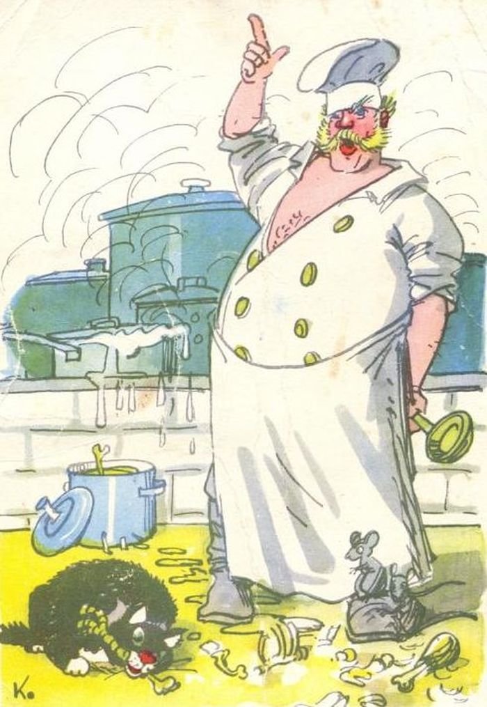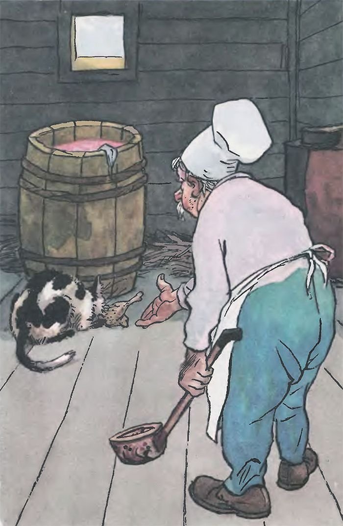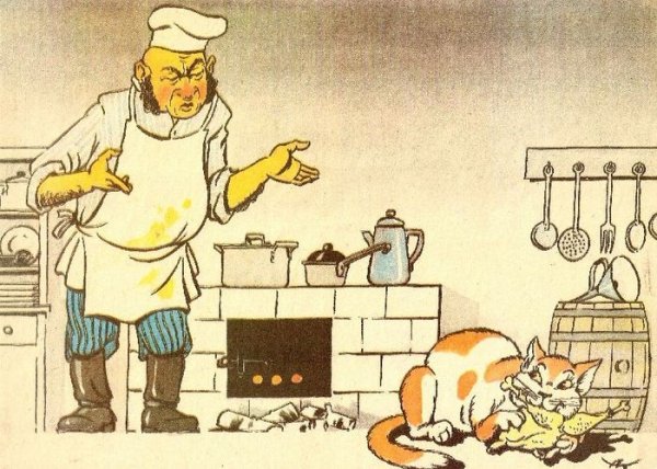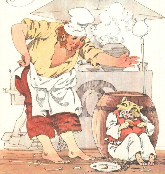 Эта яркая иллюстрация показывает веселую сцену, где кошка и повар находятся рядом. Кот подвинулся поближе к повару, который серьезно занят приготовлением блюда. Он стоит перед огромной деревянной доской, на которой лежат разные ингредиенты и кухонные принадлежности. Кот с любопытством наблюдает за каждым движением повара, будто хочет помочь ему или узнать секреты его искусства. Их взаимодействие создает атмосферу радости и веселья, а также подчеркивает связь между домашними животными и людьми. Это иллюстрация может использоваться для книги о кулинарии или быть частью коллекции живописи, чтобы добавить жизни и тепла в любое помещение.