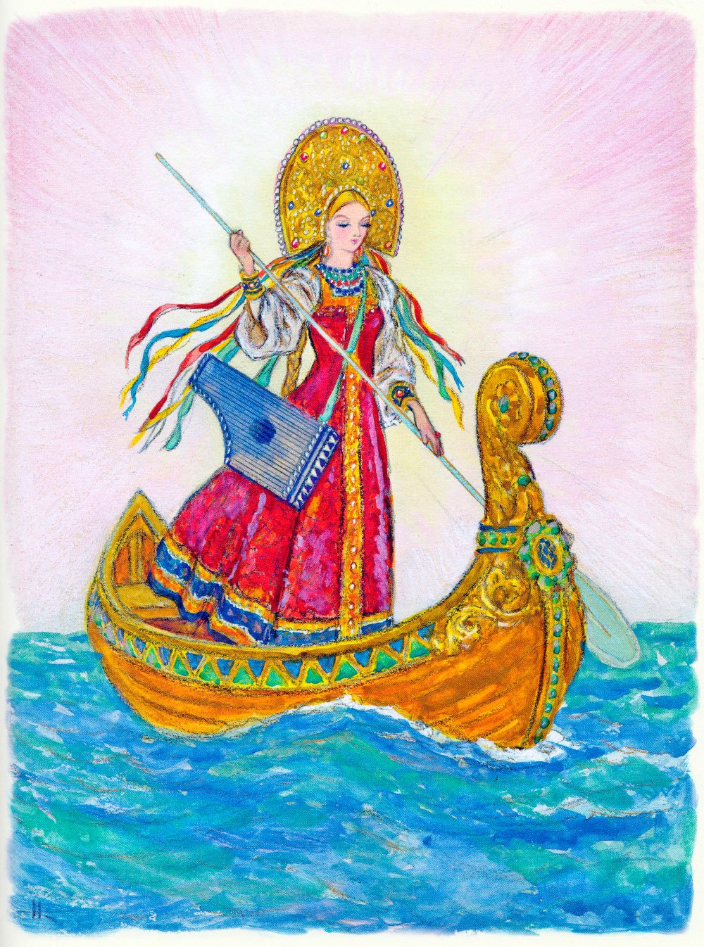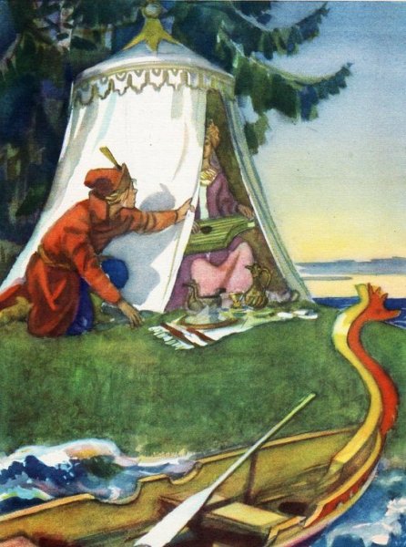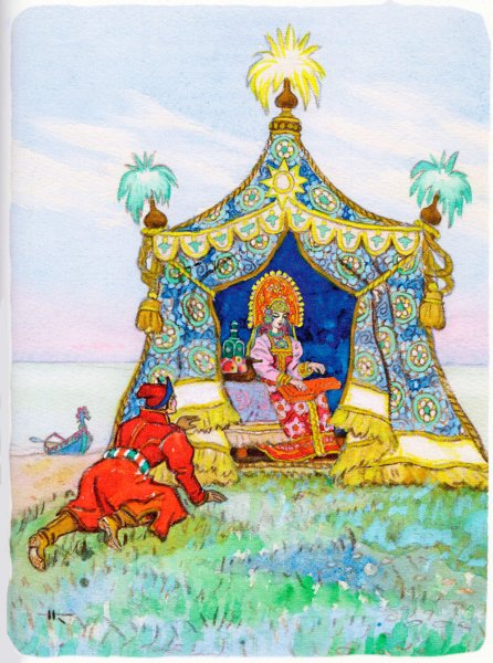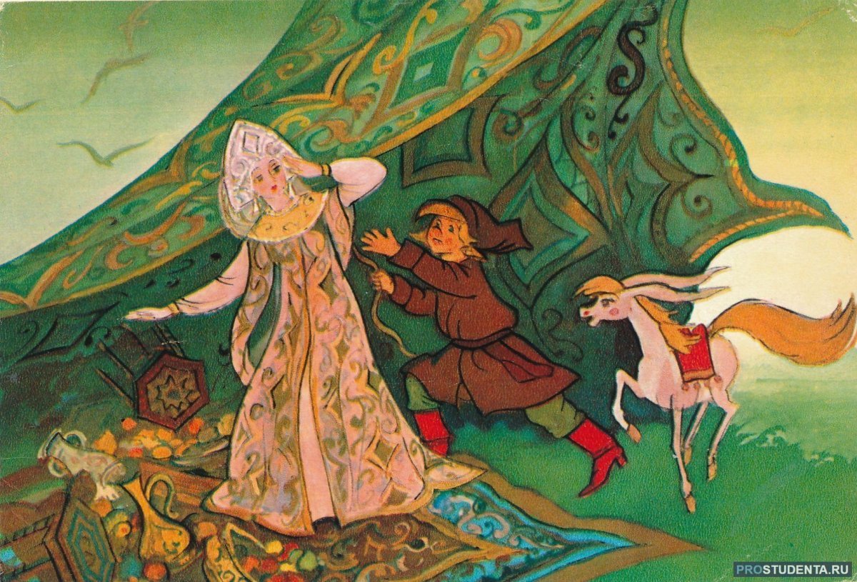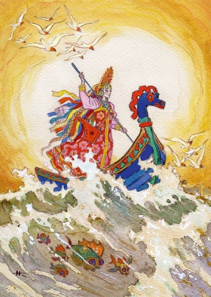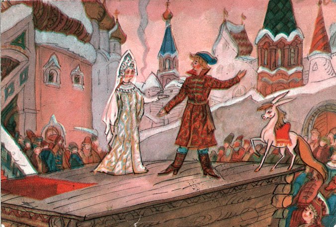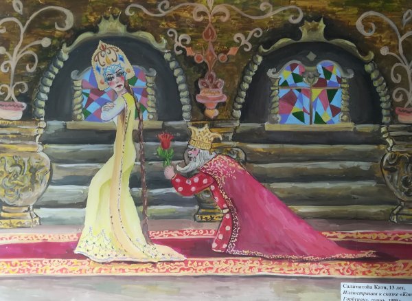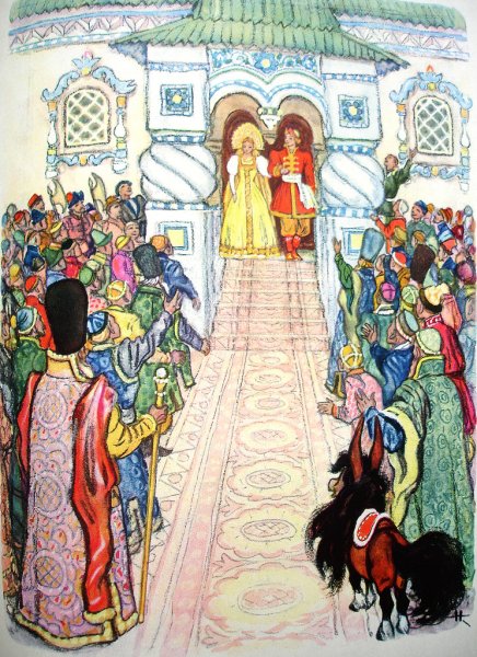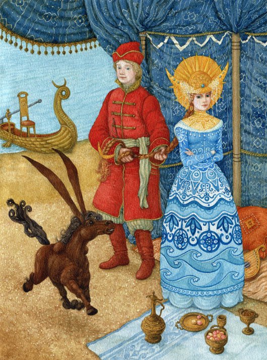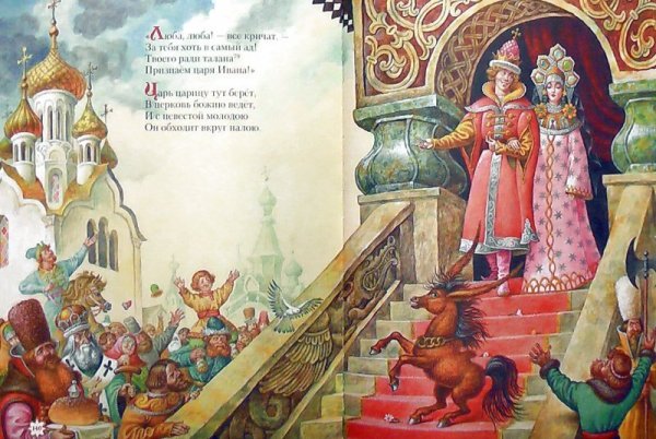 Иллюстрация "Конек-горбунок и царевна" представляет собой великолепное изображение из любимой детской сказки. На ней изображены главные герои этого захватывающего приключения - маленькая царевна и ее верный спутник, конек-горбунок. С помощью ярких красок и умелого рисунка художник передает живость и динамичность сцены. Царевна выглядит очаровательно в своем пышном платье, а конек-горбунок – милый и забавный в своей необычности. Эта иллюстрация привлечет внимание как детей, так и взрослых, и станет отличным дополнением к любому интерьеру или коллекции иллюстраций.