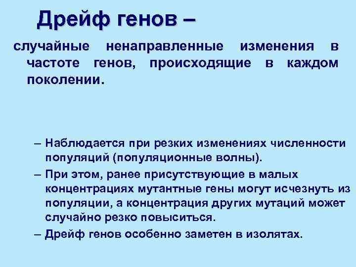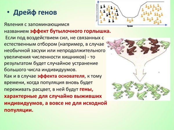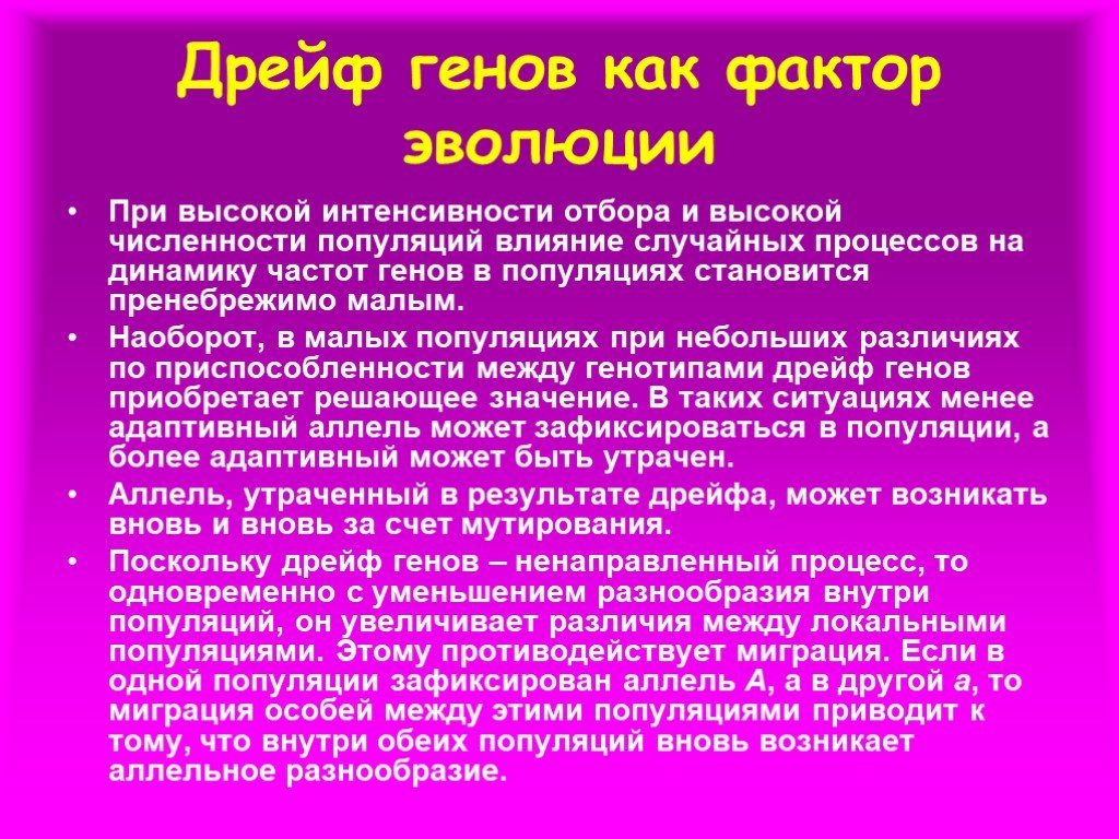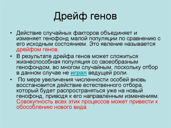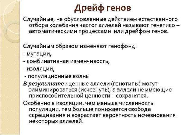 Дрейф генов - это процесс случайных изменений в генетическом материале популяции, который может привести к потере или изменению определенных генетических вариантов. Это явление имеет важные последствия для эволюции и разнообразия живых организмов. В результате дрейфа генов могут возникать новые генетические комбинации, что способствует появлению различий в фенотипе и адаптации к окружающей среде. Однако дрейф генов также может привести к утрате ценных генетических вариантов, особенно в небольших популяциях. Поэтому изучение и понимание этого процесса является ключевым для сохранения генетического разнообразия и предотвращения его утраты.