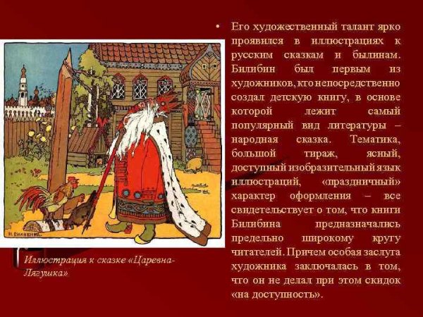 Иллюстрации Ивана Билибина к сказке "Царевна-лягушка" являются настоящим произведением искусства. Великолепное сочетание ярких цветов, изящных линий и деталей создает впечатляющую визуальную атмосферу. Каждый персонаж оживает на страницах книги благодаря тонкой проработке выразительности и эмоций. Изображения раскрывают магический мир русских народных сказок, передают атмосферу загадочности и волшебства, характерные для этой истории. Эти уникальные иллюстрации погружают читателя в мир фантазии и вдохновляют на новые приключения. Они станут неотъемлемым компонентом любой коллекции книг или подарком для ценителей искусства.