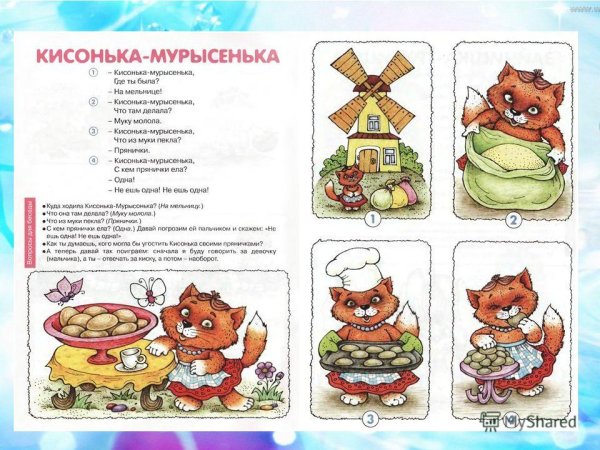 Яркая иллюстрация к потешке "Кисонька мурысонька" позволит взглянуть на эту забавную историю совершенно по-новому. На картине можно увидеть маленького котенка, который игриво скрывается за углом, прикидываясь мурлыкой. Его большие глаза наполнены любопытством, а пушистый хвостик трепещет от волнения. Нежные цвета и детали изображения делают иллюстрацию привлекательной для самых маленьких читателей, а также помогут визуально передать атмосферу веселой и забавной истории. Эта яркая иллюстрация станет отличным дополнением к потешке и подарит радость и улыбку каждому, кто решит окунуться в мир кисоньки Мурысоньки.