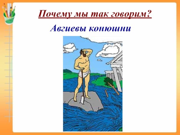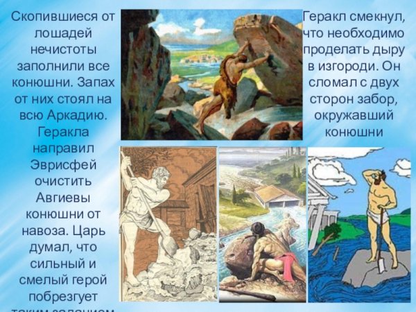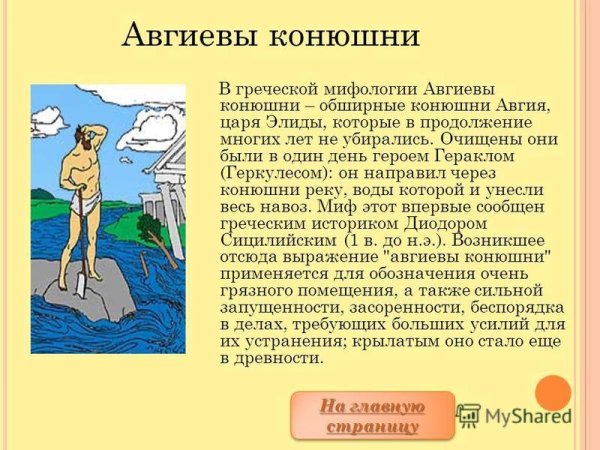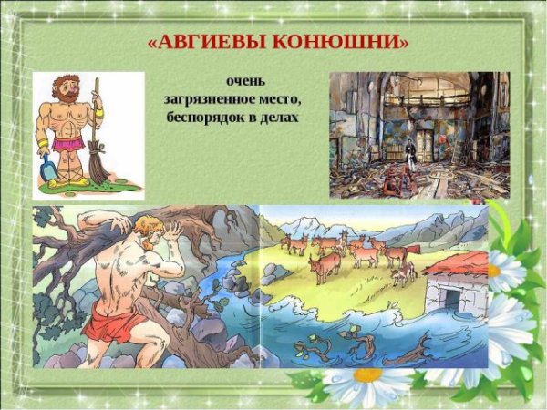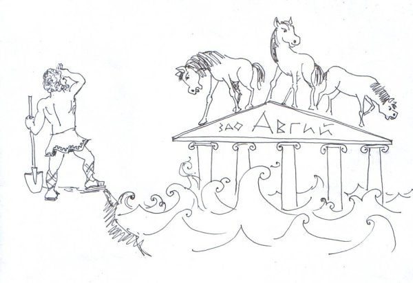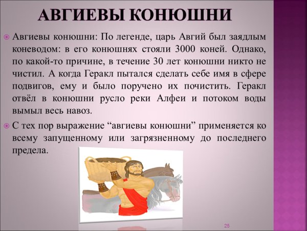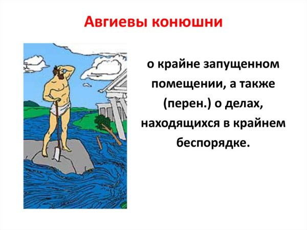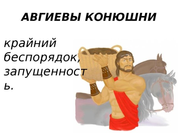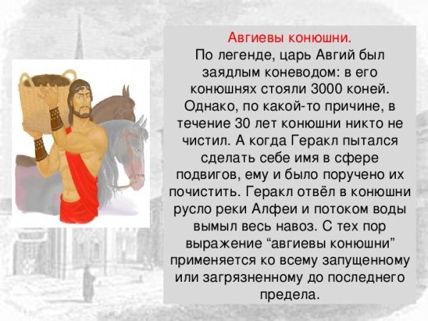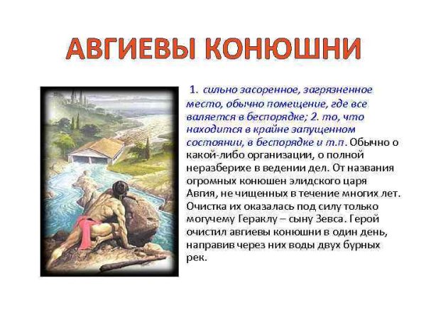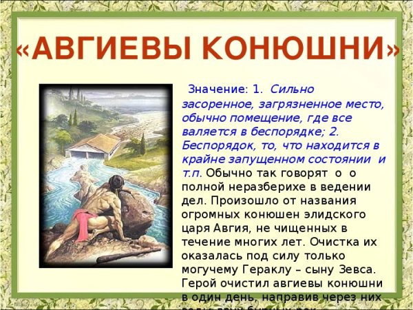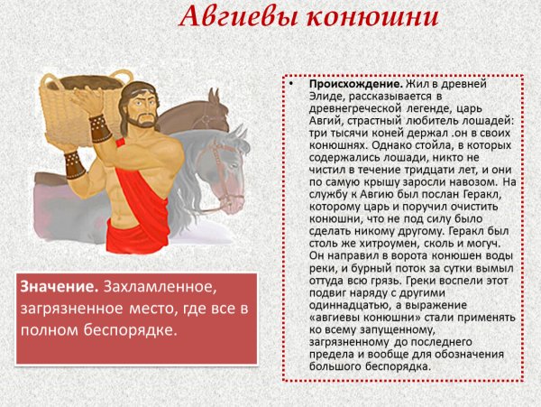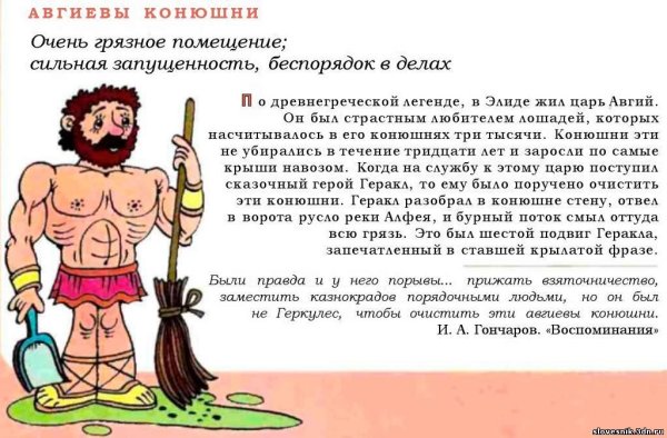 Авгиевы конюшни - это фразеологизм, который происходит из древнегреческой мифологии. Согласно легенде, герой Геракл должен был очистить огромные конюшни царя Авгия, в которых накопилось огромное количество навоза. Однако, вместо того чтобы убирать его вручную, Геракл прорыл реку и направил ее поток через конюшни, таким образом освободив их от грязи и загрязнения. Иллюстрация к этому фразеологизму может быть воспринята как символ решительного и эффективного подхода к сложным задачам, когда необходимо использовать нестандартные методы или находить новые пути для достижения поставленных целей.