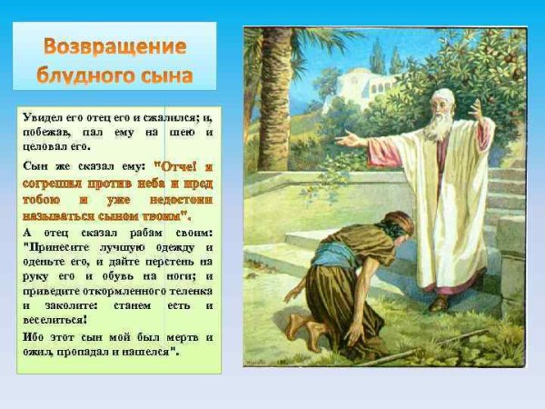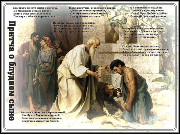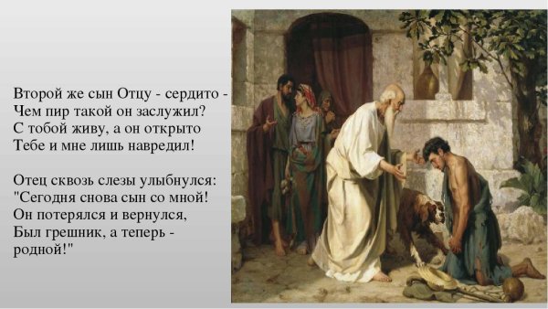 Притча о блудном сыне известна многим и является одной из самых известных и любимых притч Библии. Эта история рассказывает нам о молодом человеке, который покинул своего отца и ушел вдали, живя беззаботной и разгульной жизнью. Однако, когда он исчерпал все свои средства, он оказался на самом дне и ощутил глубокую нужду. Тогда он решил вернуться к отцу и испросить прощение за свои поступки. Как только отец увидел своего сына, он не только принял его обратно, но и устроил большой праздник в его честь. Притча о блудном сыне служит уроком о понимании и прощении, а также о том, что всегда есть возможность измениться и начать новую жизнь. Иллюстрации этой притчи помогают наглядно передать ее содержание и эмоциональную глубину, заставляя нас задуматься о наших собственных поступках и ценности семейных уз.