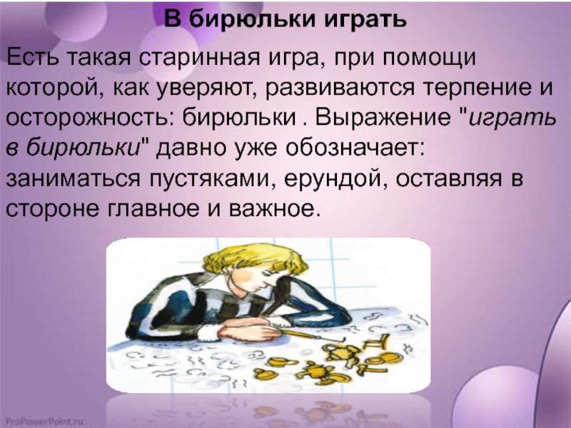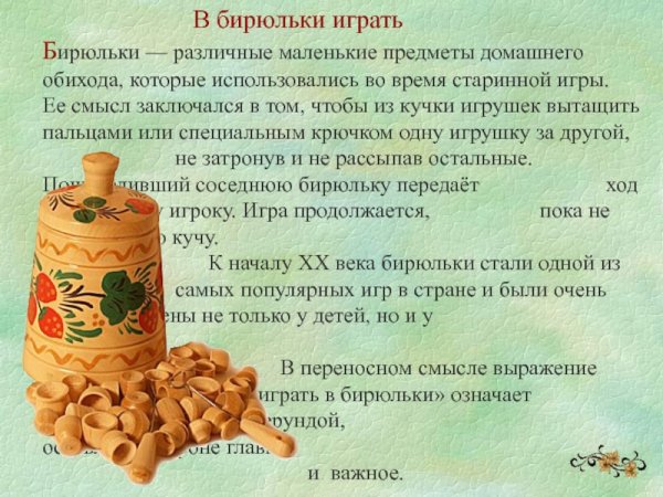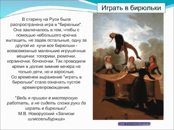 Иллюстрация к выражению "в бирюльки играть" представляет собой яркую и живописную картину, на которой изображены дети или взрослые, занятые игрой в традиционную народную игру. В центре внимания находится специальная деревянная площадка с отверстиями, в которые игроки должны попадать камешками или шариками. Вокруг площадки размещаются участники игры, которые наблюдают и аплодируют за каждым удачным броском или попаданием. Все лица на картине излучают радость и веселье, демонстрируя свое мастерство и умение точно целиться. Яркие цвета и детализация всех элементов создают ощущение динамичности и энергии, передавая атмосферу веселой и командной игры в бирюльки. Эта иллюстрация является отличным способом визуализации самого процесса игры и позволяет зрителю окунуться в атмосферу настоящего народного развлечения.