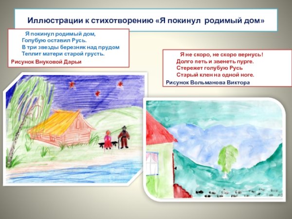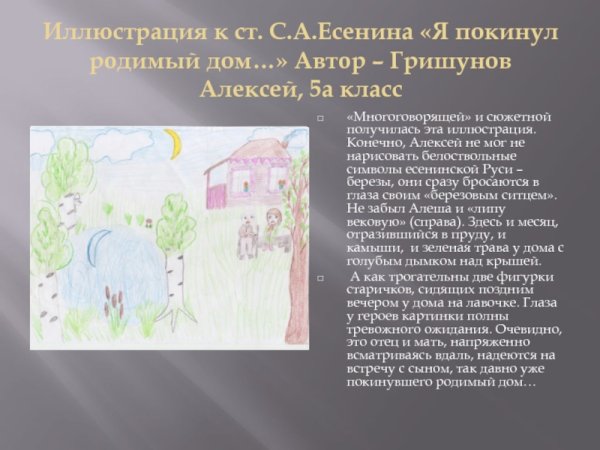 Иллюстрация "Я покинул родимый дом" передает мощное эмоциональное содержание и вызывает глубокие чувства у зрителя. Возможно, это изображение отражает переезд или изменение в жизни, когда любимое место остается позади. Оно может быть символом расставания с прошлым и начала новой главы. Яркие цвета или темные оттенки, использованные в иллюстрации, также могут создавать определенную атмосферу и передавать настроение автора. Эта работа искусства великолепно передает сложность и противоречия, сопровождающие процесс перемещения и потери, заставляя зрителя задуматься о своих собственных переживаниях и эмоциях.