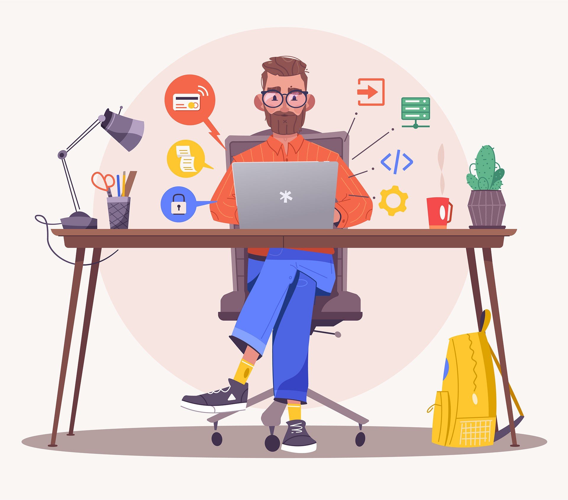 Наша иллюстрация "Программист" представляет собой яркое воплощение мира информационных технологий. Она позволяет взглянуть на эту профессию с новой стороны, раскрывая перед зрителем сложность и креативность программирования. На иллюстрации изображен программист, погруженный в свой творческий процесс, окруженный символами кода и линиями алгоритмов. Его фокусировка и усердие переданы через детали: выражение лица, напряженная поза и интенсивность работы с компьютером. Данная иллюстрация подходит для использования в различных проектах, связанных с IT-сферой, программированием и обучением. Она поможет привлечь внимание аудитории и передать ключевые ценности этой профессии.