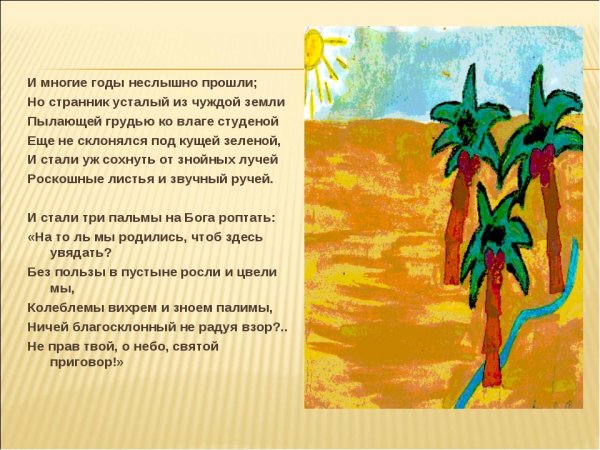 Иллюстрация к восточному сказанию "Три пальмы" воссоздает магическую атмосферу и загадочность этой истории. На ней изображены три высокие пальмы, которые символизируют силу, мудрость и долголетие. Ветви пальмы замысловато переплетаются, создавая впечатление плетеного узора, который напоминает о причудливых путешествиях главных героев их преодолении испытаний и открытии тайн. Яркие цвета и детали, использованные художником, придают работы живописности и позволяют полностью погрузиться в мир сказочных приключений. Эта иллюстрация является не только украшением книги, но и способствует лучшему пониманию и восприятию сказания, заставляя читателей задуматься о глубинном смысле произведения и его мудрых уроках.