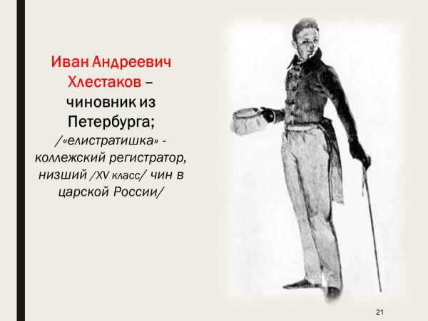 Хлестаков - это главный персонаж комедии Николая Васильевича Гоголя "Ревизор". Он представляет собой типичного обывателя, который впервые попадает в большой город и становится объектом манипуляций со стороны коррумпированного общества. Хлестаков изображен как наивный и находчивый человек, который легко поддается обману и сам совершает ошибки. Его иллюстрация может передать его неловкость, одновременно смешную и трогательную. Каждая черта его лица и выражение глаз помогут передать его непосредственность и открытость, а также его неуклюжесть в ситуациях, которые для него новы и непонятны. Иллюстрация Хлестакова позволит зрителям лучше понять его характер и внутреннюю борьбу, создавая приятное ощущение узнаваемости и сопереживания.