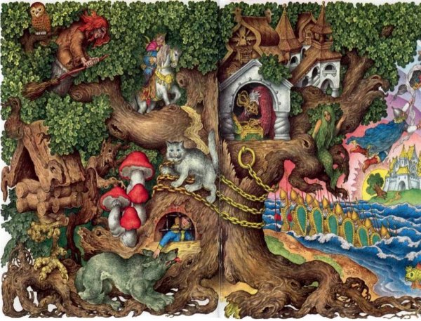Иллюстрация к сказке "У лукоморья дуб зеленый" - это визуальное изображение, которое привлекает внимание и погружает нас в мир магии и фантазии. На этой иллюстрации мы видим огромный дуб, его зеленые и густые ветви кажутся неприступными и загадочными. Сказка "У лукоморья дуб зеленый" написана Александром Пушкиным и рассказывает о приключениях молодого человека, который отправляется в страну удивительных событий и необычных существ. Эта иллюстрация передает атмосферу сказки, ее тайны и загадки, и заполняет наше воображение яркими образами и эмоциями.