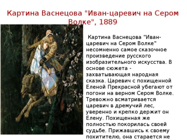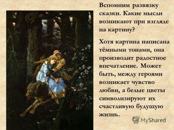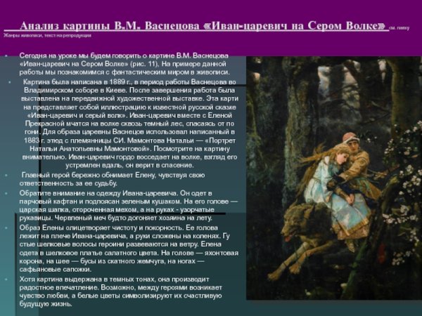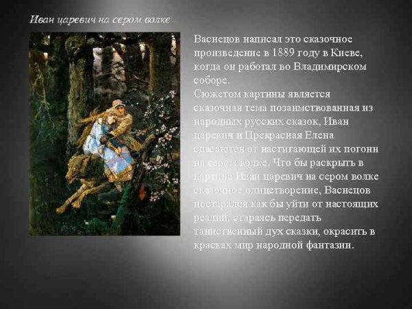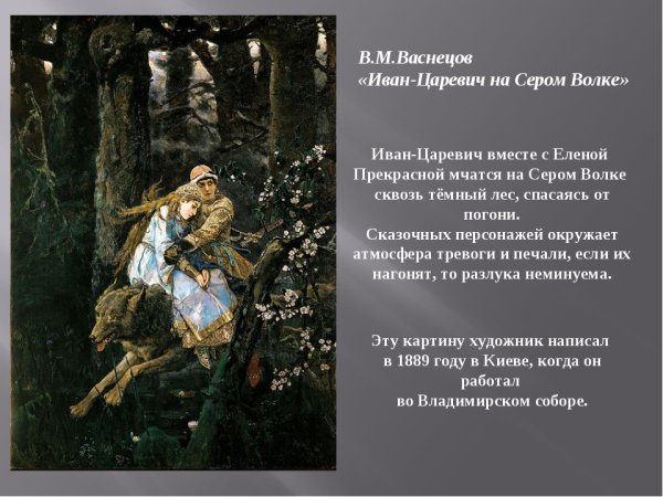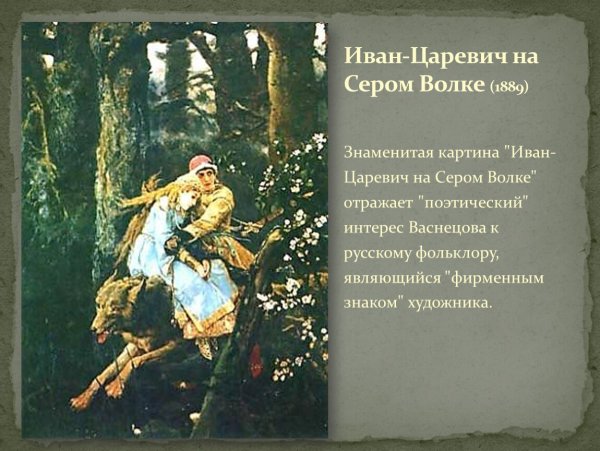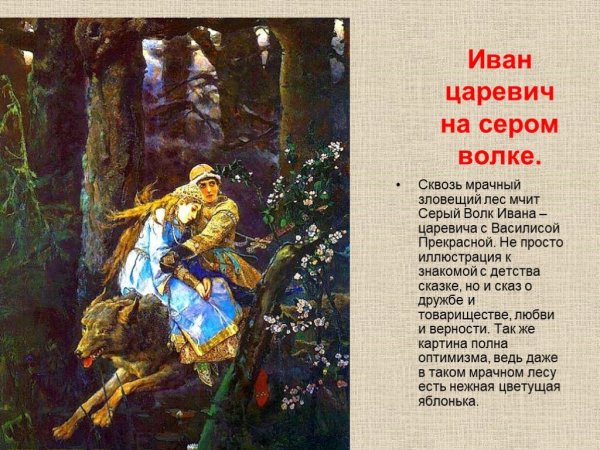 Иллюстрации к сказке "Иван Царевич и Серый Волк" от Виктора Михайловича Васнецова являются великолепным примером художественной интерпретации русских народных сказок. Васнецов, известный русский художник-передвижник, создал неповторимый стиль, который отразился и в его иллюстрациях к этой сказочной истории. Он удачно сочетает глубину символики и величие сюжета, передавая магию и завораживающую атмосферу произведения. Изображения Ивана Царевича и Серого Волка, выполненные Васнецовым с тонкостью и детализацией, позволяют зрителю окунуться в мир сказки и почувствовать эмоции и приключения главных героев. Каждый персонаж выражает свою индивидуальность и характер, что делает иллюстрации еще более живыми и запоминающимися. Используя различные техники и цветовые решения, Васнецов создал неповторимое визуальное воплощение этой знаменитой сказки, которая до сих пор остается одной из самых популярных и любимых произведений. Открывая страницы книги с иллюстрациями Васнецова, мы погружаемся в мир волшебства, фантазии и приключений, который так привлекателен для детей и взрослых.