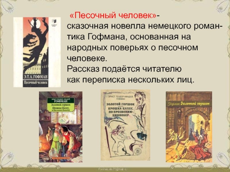 "Песочный человек" - это замечательная сказка, написанная известным немецким писателем Э.Т.А. Гофманом. В этой истории рассказывается о юном мальчике по имени Натан, который в один прекрасный день находит загадочную флакончик с песком. Натан не подозревает, что этот песок обладает магическими свойствами, и когда он начинает его использовать, то появляется перед ним загадочный песочный человек. Именно с этого момента начинаются захватывающие приключения, где герой отправляется в увлекательное путешествие вместе с песочным человеком. Книгу "Песочный человек" отличают яркие иллюстрации, которые помогут маленьким читателям в полной мере представить происходящие события и окунуться в волшебный мир Гофмана. Эта сказка наполнена фантазией, загадками и удивительными приключениями, которые увлекут и детей, и взрослых.