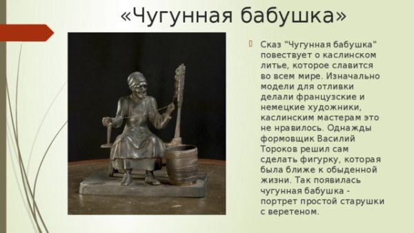 Иллюстрация к сказке "Чугунная бабушка" привлекает внимание своей уникальностью и оригинальностью. Она передает атмосферу сказочного мира и погружает зрителя в захватывающий и удивительный рассказ. Чугунная бабушка, изображенная на иллюстрации, выглядит грозной и мудрой одновременно, создавая загадочное и таинственное настроение. Каждая деталь и элемент на картине пропитаны особой энергией, что делает эту иллюстрацию незабываемой и привлекательной для всех поклонников сказок и фантастических историй. Работа художника настолько профессиональна, что можно почувствовать всю силу и мощь чугунной бабушки, а также ее важную роль в развитии сюжета сказки. Эта иллюстрация является неотъемлемой частью сказочного мира и безусловно заслуживает внимания и признания.