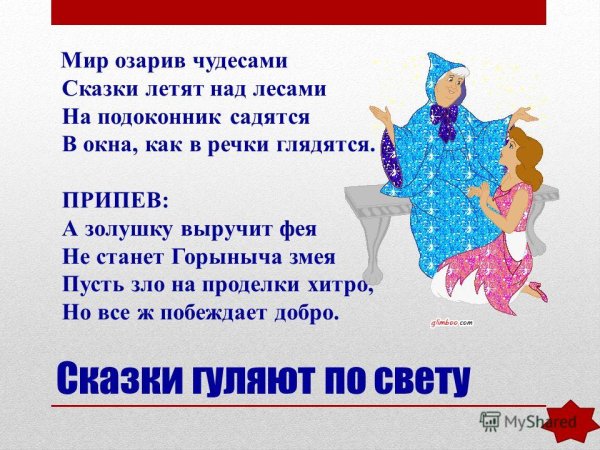 Иллюстрация к песне "Сказки гуляют по свету" воплощает в себе магию фантазийного и волшебного мира. На рисунке можно увидеть яркие и цветные образы известных сказочных персонажей, которые прогуливаются по миру, раскрывая свою неповторимую индивидуальность. В каждой детали эта иллюстрация передает атмосферу волшебства и таинственности, принося чувство радости и восторга. Благодаря своей красоте и оригинальности, она способна запомниться и покорить сердца всех любителей сказок и музыки.