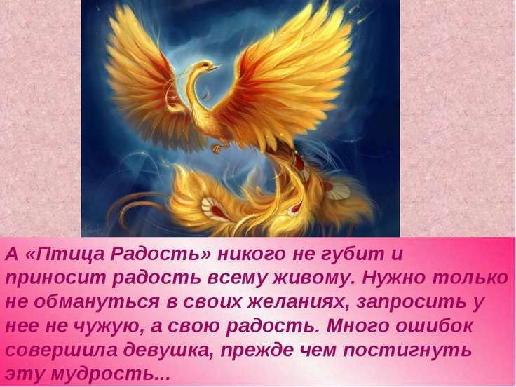 Иллюстрации к сказке "Птица Радость" - это волшебные и красочные образы, которые позволяют окунуться в удивительный мир этой захватывающей истории. Каждая страница оживает благодаря ярким цветам, точным деталям и изящным линиям, создавая атмосферу волшебства и приключений. Картинки передают неповторимую эмоциональность и глубину персонажей, позволяя читателю в полной мере проникнуться сюжетом и почувствовать радость и волшебство, которые присутствуют в этой сказке. Иллюстрации к сказке "Птица Радость" – это настоящее художественное произведение, которое буквально заставляет нас улыбаться и раскрывает перед нами мир фантазии и волшебства.
