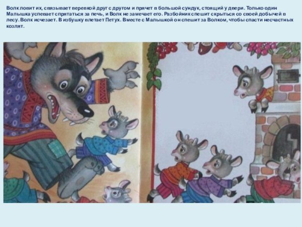 Детская сказка "Волк и семеро козлят" остается одной из самых узнаваемых и любимых историй для малышей. И чтобы создать еще большую магию вокруг этой замечательной истории, иллюстраторы предлагают свои яркие и красочные картинки. На этих иллюстрациях дети смогут увидеть как забавных, так и трогательных моментов из сказки. Картинки позволяют лучше погрузиться в сказочный мир, делая чтение более интересным и запоминающимся. Они помогают детям лучше воспринимать события и переживания главных героев, а также развивают их воображение и внимание к деталям. Благодаря этим иллюстрациям, дети смогут не только насладиться чтением, но и увидеть сказочных персонажей в живописных образах.