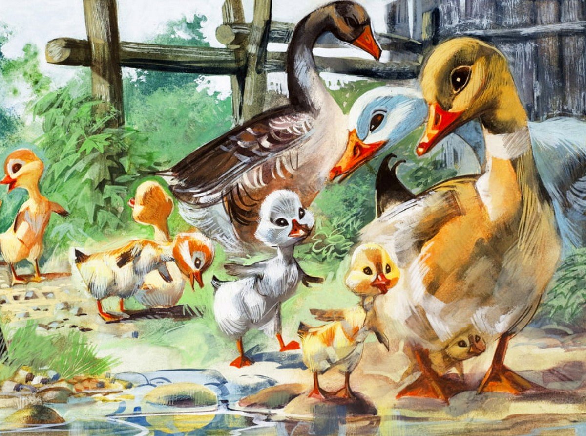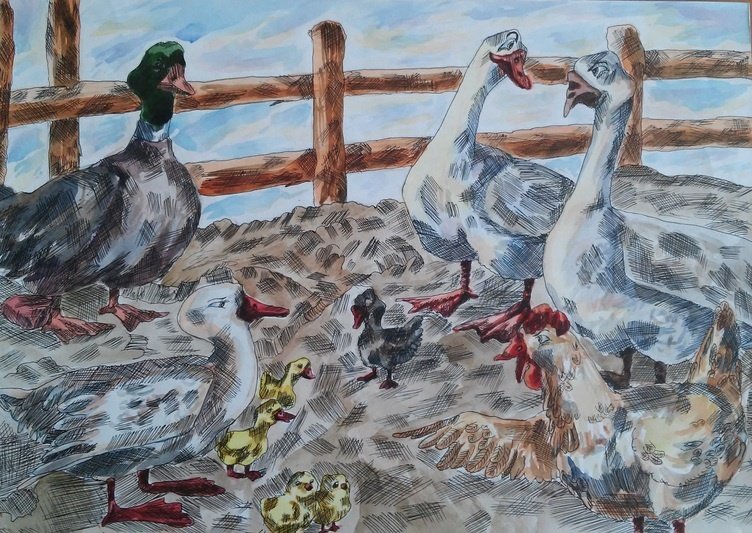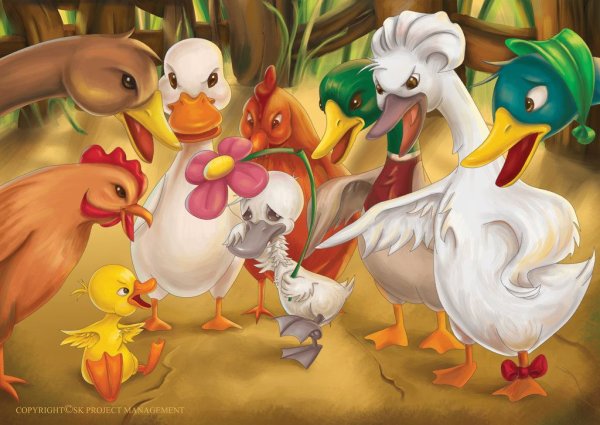 Великолепная иллюстрация к сказке "Гадкий утенок" привлекает внимание своей прекрасной передачей атмосферы птичьего двора. Картина оживляет известный сюжет, позволяя зрителю окунуться в мир приключений главного героя. Яркие цвета и детализация каждого персонажа сразу же привлекают взгляд и создают чувство реальности происходящего. Иллюстратор отлично передал эмоции и настроения персонажей, так что можно чувствовать радость, грусть и надежду, которые присутствуют в сказке. Эта иллюстрация безусловно станет ярким акцентом в любой коллекции, а также отличным подарком для любителей классических сказок и искусства.