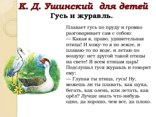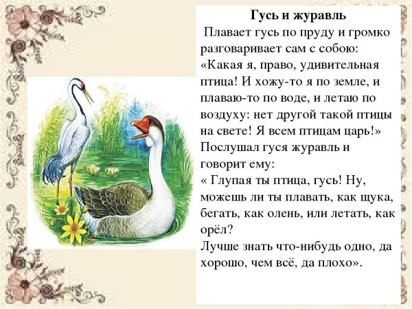 Иллюстрация к сказке "Гусь и журавль" является олицетворением соперничества и дружбы. В ней изображено два птицы, гусь и журавль, стоящие рядом друг с другом. Гусь, большой и крепкий, символизирует силу и мощь, в то время как журавль, стройный и изящный, представляет грацию и ловкость. Их различные характеры и способности отражаются не только в иллюстрации, но и в самой сказке, где они соревнуются в прыжках и путешествуют вместе. Эта яркая иллюстрация помогает передать главную идею сказки - важность уважения и сотрудничества, а не конкуренции и разделения.