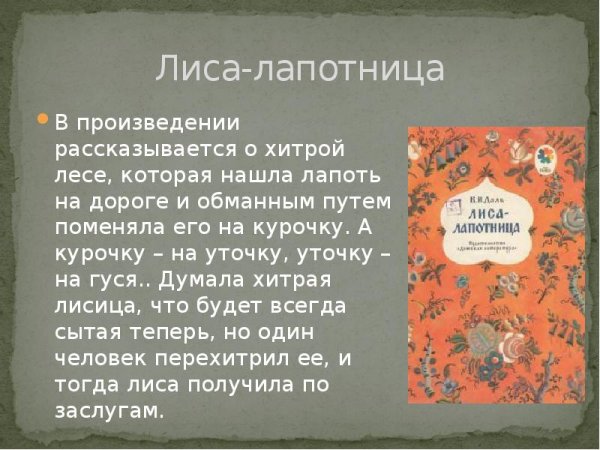 Лиса лапотница - это увлекательная и поучительная сказка, которая не только захватывает воображение, но и оставляет глубокий след в сердце каждого читателя. Главная героиня этой истории - лиса, которая обладает уникальным мастерством изготовления лапотников, традиционной обуви в народной культуре. Сказка наполнена яркими иллюстрациями, которые помогают визуализировать все происходящее и почувствовать атмосферу древней русской сказки. Читатели всех возрастов будут восхищены приключениями лисы лапотницы и узнают важные жизненные уроки о труде, творчестве и верности своему делу. Эта сказка станет прекрасным подарком как для детей, так и для взрослых, и наверняка будет прочитана снова и снова.