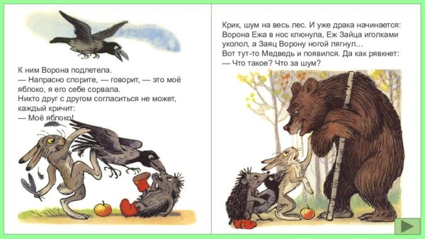 Иллюстрации к сказке "Яблоко" С. Сутеева восхищают своей яркостью и оригинальностью. Каждая картинка, созданная талантливым художником, словно оживает на страницах книги и переносит нас в удивительный мир сказочных событий. Мастерство С. Сутеева выражается в множестве деталей и передаче эмоций героев. Иллюстрации к сказке "Яблоко" не только поражают своей красотой, но и помогают маленьким читателям лучше понять историю, рассказанную автором. Эти яркие и запоминающиеся картинки станут настоящим украшением любой детской библиотеки и принесут радость и вдохновение каждому, кто откроет страницы этого захватывающего произведения искусства.