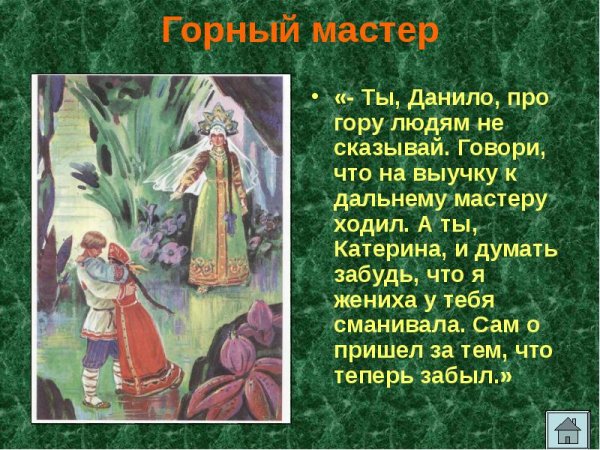 Иллюстрация к сказке "Горный мастер" А.П. Бажова – это волшебное произведение искусства, которое оживляет не только слова самой сказки, но и воображение читателя. Красочные и детальные рисунки воссоздают мир горного пространства и его обитателей: умелых кузнецов, мудрых горных духов и загадочных каменных героев. Они позволяют проникнуться атмосферой сказочной реальности, где силой творчества, веры и доброты можно преодолеть любые препятствия. Иллюстрация к сказке "Горный мастер" станет настоящим украшением для любого любителя фантастики и магии, так как отражает великолепие природы и ее взаимодействие с человеком. Великолепные детали, цветовая гамма и выразительность изображений поражают воображение и заставляют задуматься о смысле сказок, их мудрости и вечной актуальности.