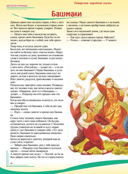 Иллюстрация к сказке "Башмаки" - это яркое и увлекательное воплощение татарской народной сказки. На картине можно увидеть главного героя - молодого парня, который оказывается волшебными башмаками. Они помогают ему решить различные задачи и преодолеть препятствия, которые встречаются на его пути. В иллюстрации чувствуется национальный колорит, который передает атмосферу восточной сказки. Яркие цвета и детализация создают ощущение присутствия в мире сказочных приключений. Эта иллюстрация станет отличным дополнением к любой сказочной коллекции и подарит радость и вдохновение всем, кто полюбил эту чудесную татарскую сказку.