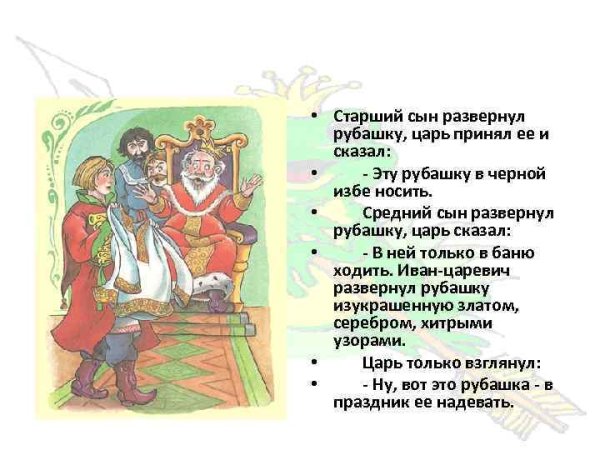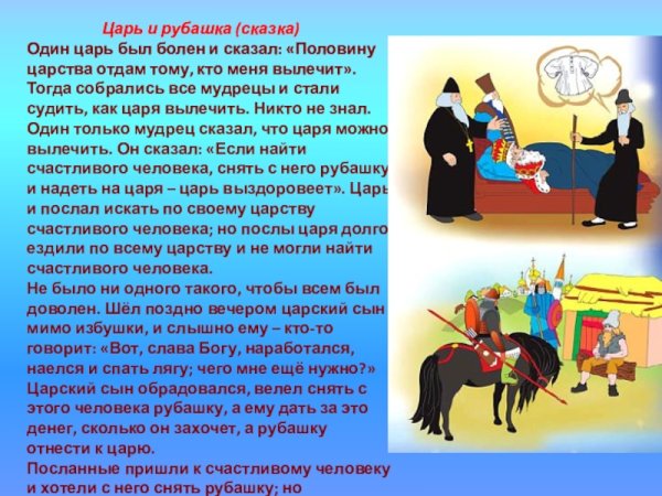 Иллюстрация к сказке "Царь и рубашка толстого" является ярким и увлекательным дополнением к этому классическому произведению. Рисунок передает атмосферу волшебства и приключений, которая присутствует на страницах сказки. На иллюстрации изображены главные персонажи - царь и рубашка толстого, а также другие важные элементы сюжета. Яркие цвета и детализированные детали создают ощущение присутствия в мире сказки, позволяя читателю еще глубже погрузиться в историю и пережить эмоции героев. Иллюстрация к сказке "Царь и рубашка толстого" является прекрасным способом визуализации событий и позволяет в полной мере насладиться чтением этой увлекательной истории.