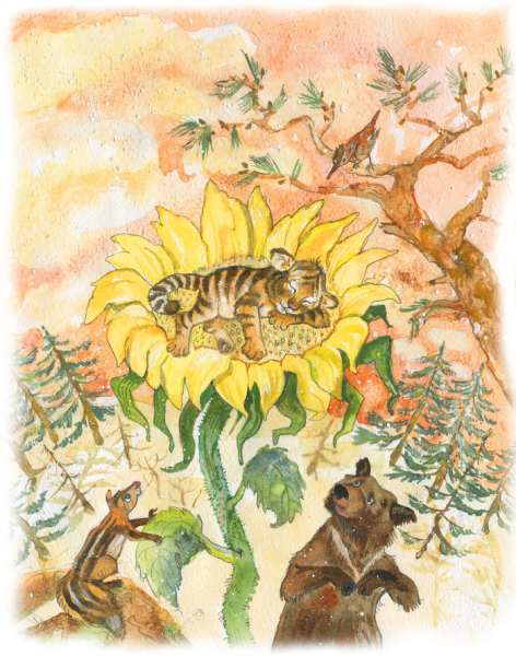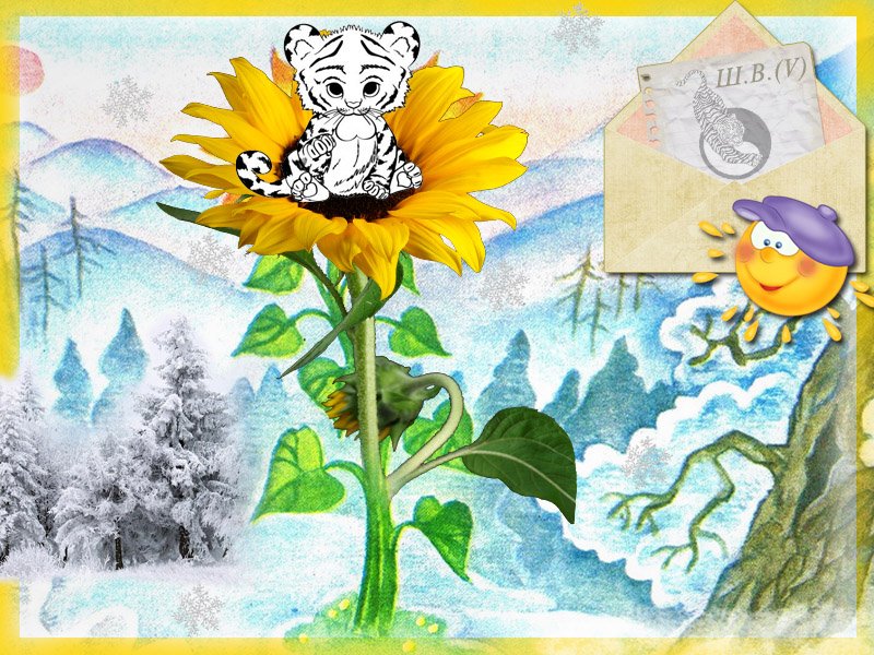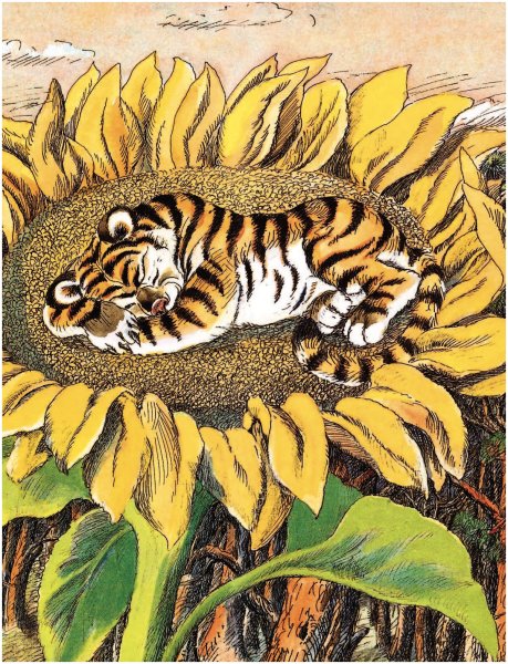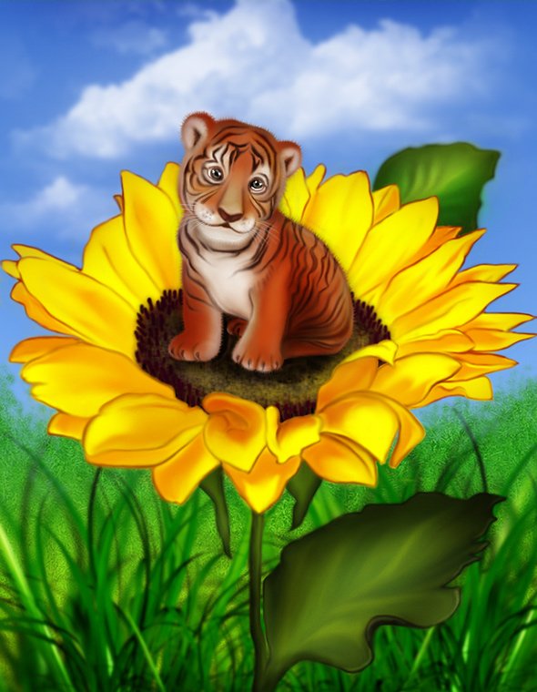 Погрузитесь в волшебный мир сказок с тигренком на подсолнухе! Эта яркая иллюстрация позволяет нам окунуться в удивительное приключение вместе с нашим героем. Тигренок, сидя на огромном подсолнухе, ощущает радость и веселье, которые передаются каждому, кто рассматривает этот рисунок. Краски и детали иллюстрации привлекают внимание и создают атмосферу полного волшебства. Воображение просто разыгрывается при виде этого яркого и увлекательного изображения. Отправляйтесь вместе с тигренком на подсолнухе в захватывающее путешествие по волшебным сказкам!