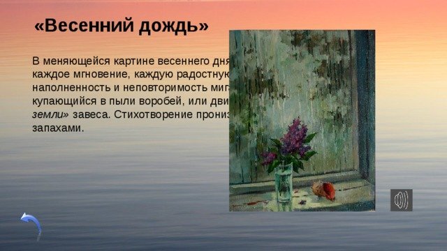 Весенний дождь - это как иллюстрация к самому жизнеутверждающему стихотворению. Он приносит свежесть, обновление и оживление всего вокруг. Капли дождя падают на землю, разбрызгиваясь и создавая мелодичный ритм. Зелень просыпается от спячки, распуская свои нежные листочки под нежными струями дождя. Аромат весенних цветов наполняет воздух, приятно смешиваясь со свежестью после дождя. Все это создает неповторимую атмосферу, наполненную чувством нового начала и бесконечного прекрасного. Весенний дождь - это иллюстрация к самой сущности природы, ее возрождению и великому творению.