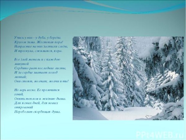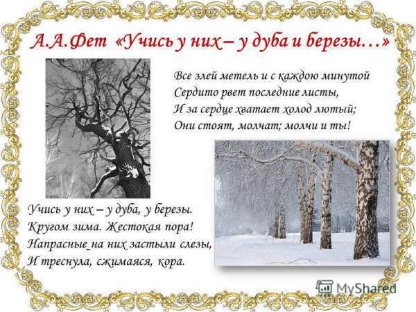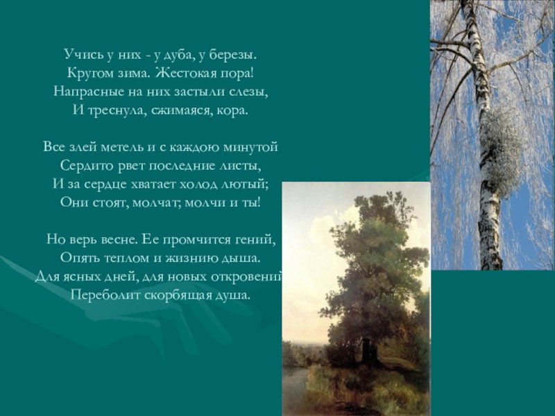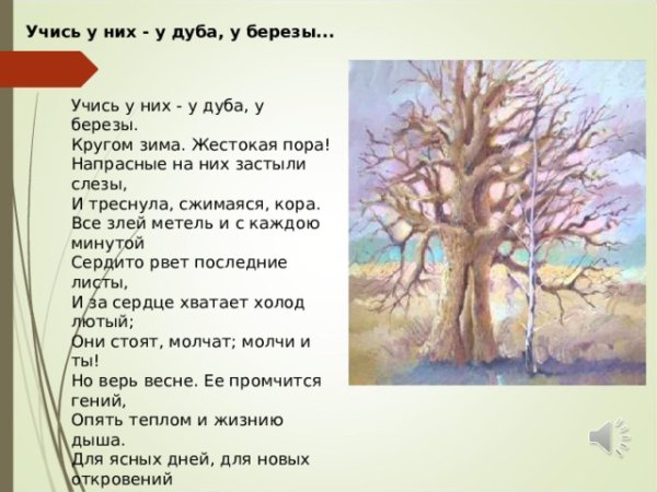 В иллюстрации к стихотворению "Учись у них у дуба у березы" оживает прекрасное зрелище: могучий дуб возвышается на фоне нежной березы, создавая гармоничный контраст в природном пейзаже. Дуб, символ силы и уверенности, является образом мудрости и опоры, а береза, покрытая зелеными листьями, олицетворяет нежность и жизненную силу. Это иллюстрация напоминает о важности учиться у природы - ее мудрости, терпении и силе, чтобы стать сильным и уверенным в себе. Сочетание двух растений на иллюстрации также символизирует взаимодействие и взаимовлияние, которые присущи окружающему миру. Это потрясающая визуальная интерпретация стихотворения, которая запечатлевает его главные темы и вызывает чувство гармонии и вдохновения.