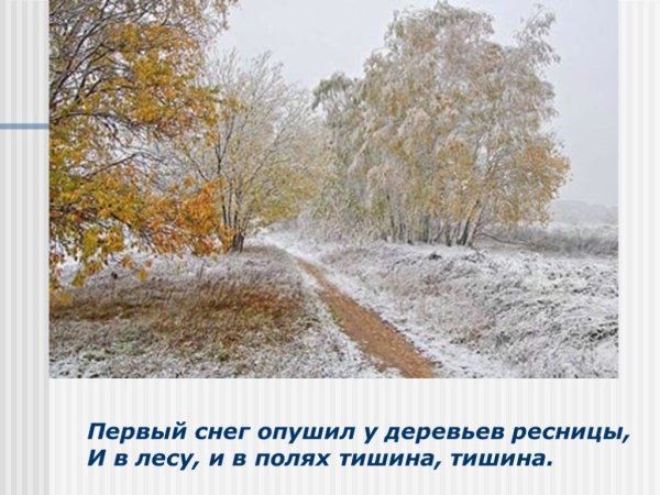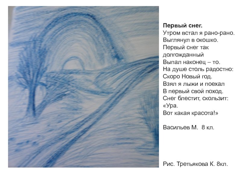 "Первый снег" - волшебный момент, когда нежные снежинки начинают падать с неба, словно белоснежные перышки. Эта иллюстрация к стихотворению передает всю красоту и волшебство этого момента. На рисунке можно увидеть тихий зимний пейзаж, покрытый свежим снегом, который создает чистоту и тишину. Березовые ветви, украшенные легким наледью, словно тонкими серебряными нитями, придают особую грацию картине. А вдалеке виднеется домик, из которого показывается колышущийся дымок - символ уюта и тепла в суровую зимнюю пору. Все эти детали делают эту иллюстрацию не только красивой, но и мечтательной, позволяя окунуться в атмосферу первого снегопада и насладиться его очарованием.
