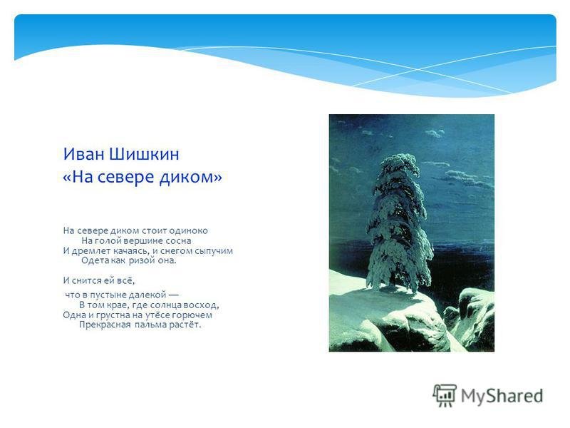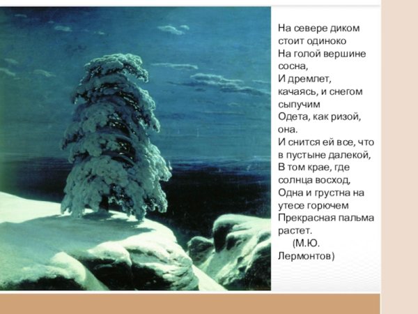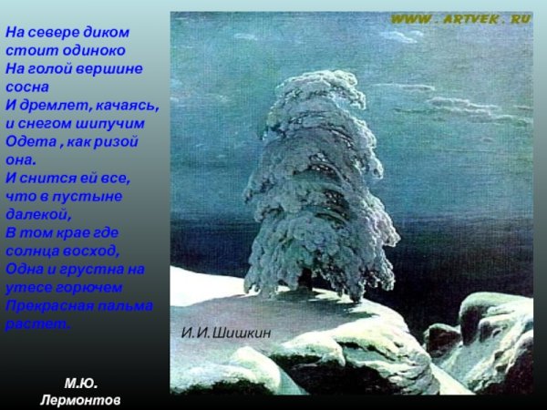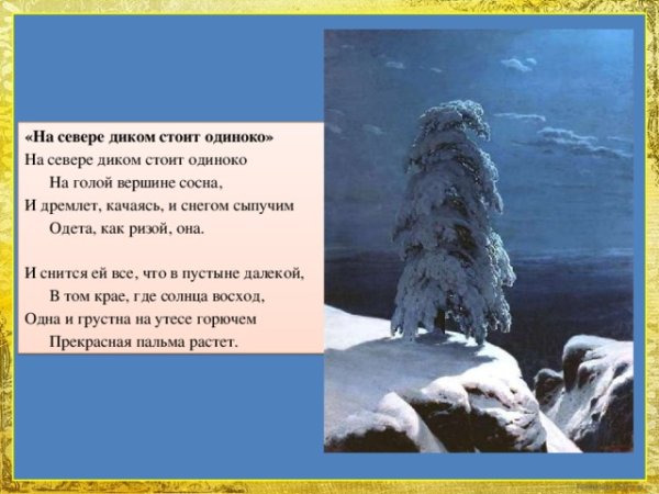 Иллюстрация к стихотворению "На севере диком" создает впечатление одиночества и изолированности. В ней отражается холодная и суровая картина северной природы, где нет ни людей, ни животных. Одинокая фигура или объект, нарисованные на иллюстрации, подчеркивают безмолвный мир и тишину этого места. Взгляд на иллюстрацию вызывает чувство уединения и позволяет зрителю в полной мере погрузиться в атмосферу загадочности и непостижимости северных ландшафтов.