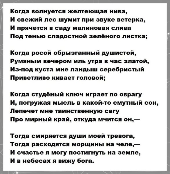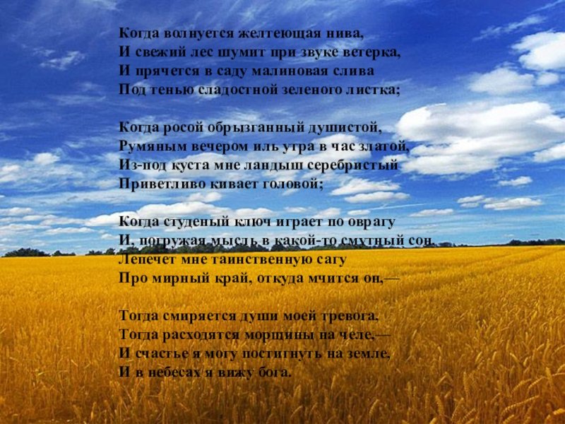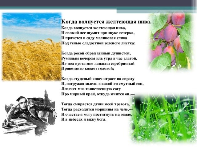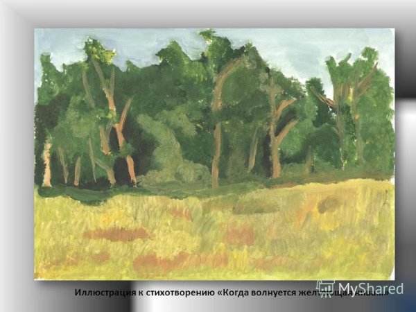 Иллюстрация к стихотворению "Когда волнуется желтеющая нива" Лермонтова – это гармоничное сочетание слов и изображений, которое передает эмоциональную и природную атмосферу произведения. Картина раскрывает нам картину волнующейся нивы, окрашенной в ярко-желтые оттенки, создавая ощущение бурлящей и непредсказуемой энергии природы. На фоне просторных полей и небесных просторов, мы видим танцующие колосья, которые подчинены мощным силам ветра. Через эту иллюстрацию передается не только красота и динамика природы, но и глубокий смысл стихотворения Лермонтова, в котором автор сплетает образы бурлящей природы и своих внутренних переживаний.