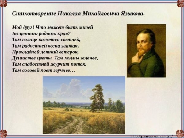 Иллюстрация к стихотворению "Родина языкова" представляет собой визуальное отражение главной тематики произведения. Она передает идею о значимости родного языка и его связи с национальной идентичностью. На иллюстрации можно увидеть различные элементы, символизирующие многообразие языков и культур, такие как книги, переплетенные лентами с надписями на разных языках, или мозаичные фрагменты, изображающие буквы и слова на разных алфавитах. Красочные и яркие цвета создают атмосферу радости и гармонии, подчеркивая важность языка как инструмента общения и выражения своих мыслей и чувств. Эта иллюстрация позволяет зрителю почувствовать глубину и богатство мира языков и привносит дополнительную эмоциональную составляющую к стихотворению "Родина языкова".