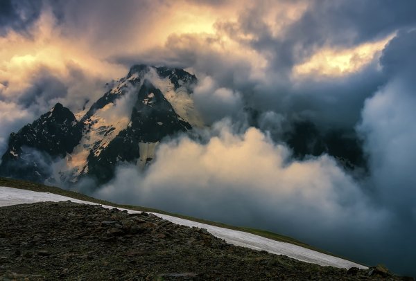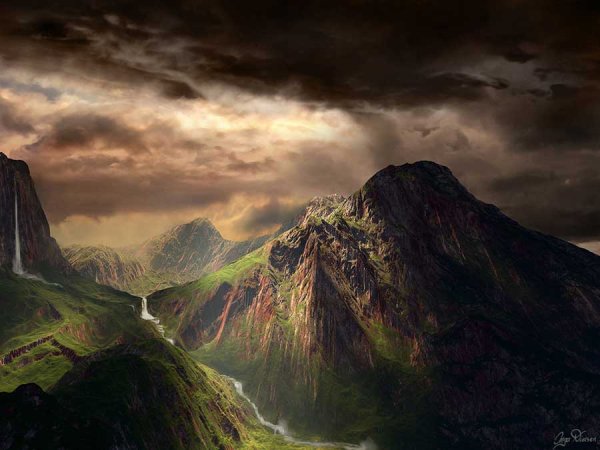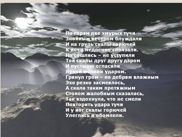 Иллюстрация к стихотворению о двух хмурых тучах, плывущих по горам, привлекает внимание своей эмоциональной силой и глубиной. На фоне величественных вершин, покрытых зелеными лесами, две темные тучи создают напряжение и непредсказуемость. Их формы напоминают загадочные образы, вызывающие разные чувства: тревогу, ожидание или мрачное предвестие. В то же время, яркое солнце, пробивающееся сквозь щели между облаками, символизирует надежду и возможность преодоления трудностей. Эта иллюстрация отлично передает атмосферу и эмоции стихотворения, заставляя зрителя задуматься о важности природных явлений и их влиянии на наши жизни.