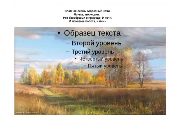 Иллюстрация "Славная осень" к стихотворению Некрасова – это великолепное художественное произведение, которое воссоздает атмосферу умиротворения и красоты осеннего ландшафта. Рисунок передает яркость и разнообразие осенних оттенков, от золотистых до красных и оранжевых, позволяя нам полностью погрузиться в мир этого сезона. В каждой детали можно увидеть тщательную проработку и внимание к деталям: осенние листья, покрывающие землю, свежий воздух, наполненный запахом листвы, и тонкие лучи солнца, проникающие сквозь покрытое росой дерево. Иллюстрация словно приглашает нас прогуляться по осеннему парку и насладиться всей его красотой и тишиной. Каждый, кто увидит этот рисунок, несомненно, будет восхищен его изяществом и эмоциональной глубиной, которые оживляют стихи Некрасова и переносят нас в чарующий мир осени.