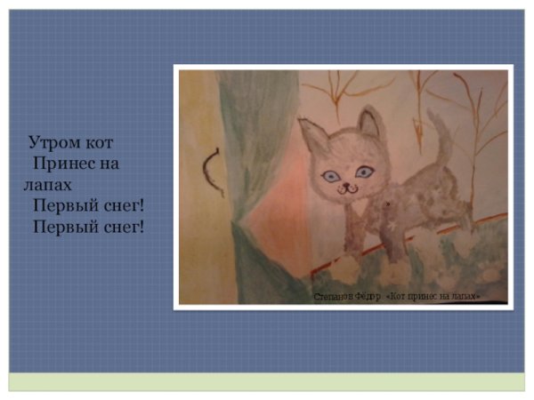 Иллюстрация к стихотворению "Первый снег" акима - это визуальное воплощение магии и волшебства зимнего времени, которое описывается в стихах. В ней прекрасно переданы эмоции и настроение, вызываемые первыми снежинками, падающими на землю. Яркие и насыщенные цвета создают ощущение хрупкости и легкости снега, а также добавляют особую атмосферу таинственности. Иллюстрация непременно привлечет внимание читателей и поможет им в полной мере погрузиться в мир сказочн