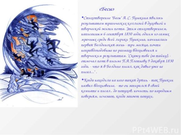 Иллюстрация к стихотворению "Бесы" - это визуальное воплощение мистического и таинственного мира, описанного в стихотворении. Она призвана передать атмосферу напряжения, страха и неведомого, которые присутствуют в тексте. Используя свою художественную интерпретацию, иллюстратор может создать образы демонов, сущностей или привидений, которые находятся в постоянной борьбе с главным героем стихотворения. Цветовая палитра и композиция иллюстрации могут быть выбраны таким образом, чтобы подчеркнуть темный и загадочный характер произведения. В результате, иллюстрация к стихотворению "Бесы" поможет зрителям или читателям лучше понять эмоциональную глубину и интригующий сюжет этого произведения.