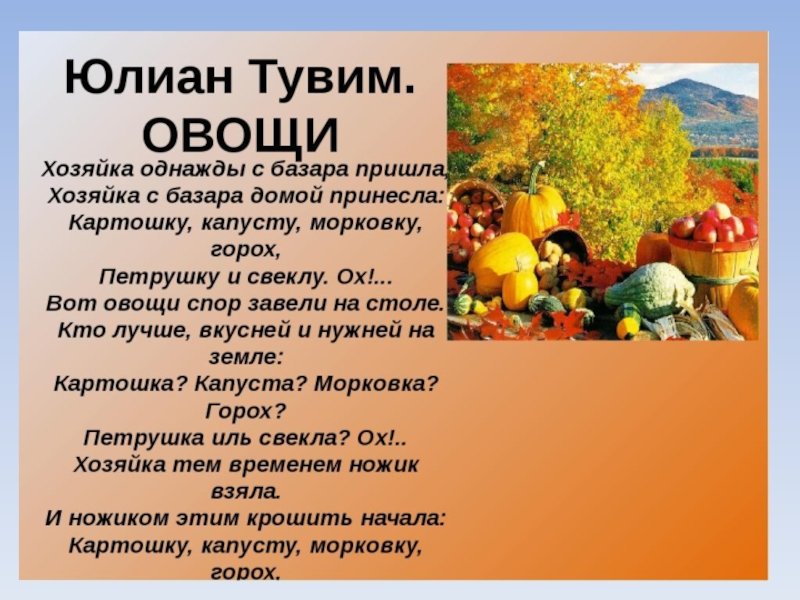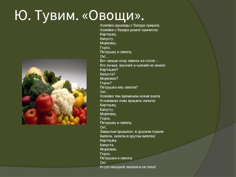 Тувим - знаменитый польский поэт, в своих стихотворениях которого часто встречаются оригинальные и необычные образы. Одним из них являются овощи, которые он использует в своих произведениях для передачи эмоций и настроений. Иллюстрации к стихотворению Тувима овощи помогут воссоздать атмосферу его творчества и подчеркнуть символическое значение, которое он придает этому мотиву. Картины, на которых изображены разноцветные овощи: сочные помидоры, хрустящие огурцы, сладкие морковки, будут отражать яркость и разнообразие эмоций, выраженных в стихах Тувима. Благодаря таким иллюстрациям можно погрузиться в мир его поэзии и увидеть, как овощи становятся символами разных переживаний и настроений.