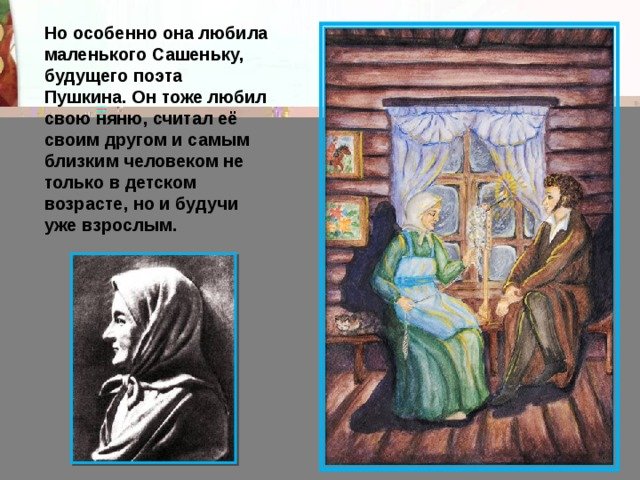 Иллюстрация к стихотворению Пушкина "Няне" – это визуальное воплощение главных мотивов и образов, которые присутствуют в этом произведении. Она передает атмосферу детства и нежности, позволяя зрителю увидеть мир глазами ребенка. На иллюстрации можно увидеть изображение няни, внимательно склонившейся над малышом, который умильно улыбается. Реалистичные детали и теплая цветовая гамма создают ощущение уюта и ласки. Такая иллюстрация сможет не только привлечь внимание читателя, но и передать ему эмоциональный отклик на произведение Александра Сергеевича Пушкина.