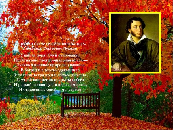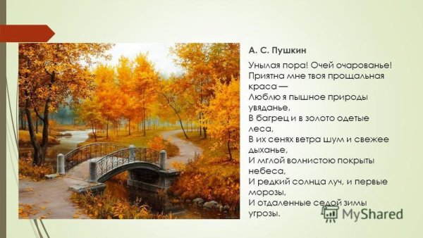 Иллюстрация к стихотворению Пушкина "Осень" представляет собой великолепное воплощение эмоций и настроения, которые описаны в данном произведении. Нежные осенние оттенки, теплые золотистые и оранжевые цвета, создают атмосферу умиротворения и меланхолии. Растительность, изображенная на иллюстрации, состоит из опавших листьев и грустно склоняющихся деревьев, что является символом ухода лета и приближения холодной поры. Весь образ наполнен ностальгией и размышлениями о быстротечности времени, о жизни и смерти. Эта иллюстрация позволяет зрителю окунуться в атмосферу осеннего прекрасия и почувствовать всю глубину чувств, которые передает великий русский поэт Александр Сергеевич Пушкин.