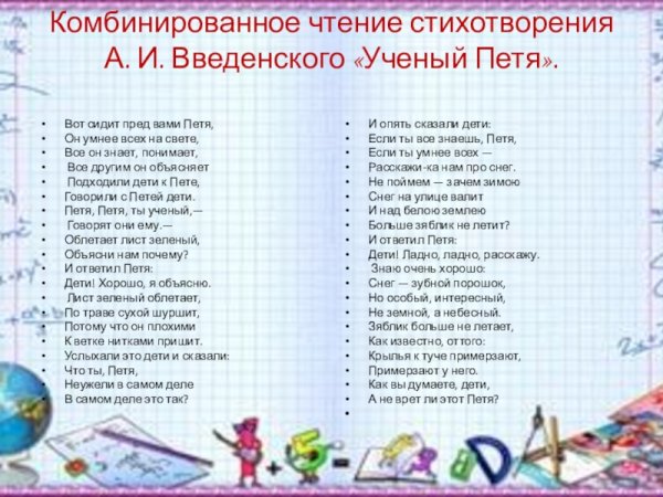 Ученый Петя - это уникальная иллюстрация, которая оживляет стихотворение на страницах книги. Она представляет собой яркий образ гениального ученого, погруженного в свое исследование и открытия. С помощью мастерского использования цветов и форм, иллюстратор передает атмосферу увлекательного мира науки, в котором каждая деталь имеет значение. Картина Ученый Петя приковывает взгляд зрителя и заставляет задуматься о бесконечных возможностях, которые открываются перед человеком в процессе поиска знаний. Она не только визуально привлекательна, но и вдохновляет на размышления о роли науки в нашей жизни и значимости образования. Независимо от возраста, Ученый Петя станет прекрасным дополнением к любому стихотворению, создавая интересную и запоминающуюся комбинацию слов и изображений.