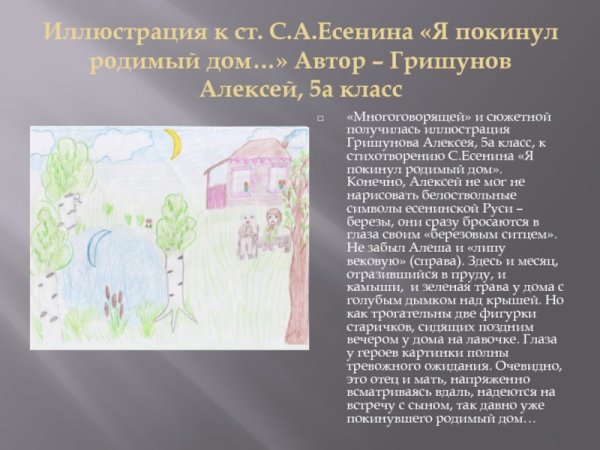 Иллюстрация к стихотворению "Я покинул родимый дом" Есенина - это визуальное отражение внутреннего состояния героя, его эмоций и переживаний. Через изображение можно передать тоску, ностальгию и одиночество, которые присутствуют в тексте стихотворения. Например, на иллюстрации можно изобразить дом, оставленный героем, покрытый листвой осенью, с угасающими окнами и пустыми дворами. Такая иллюстрация будет отражать тематику стихотворения и помогать читателю воспринять его на более эмоциональном уровне.