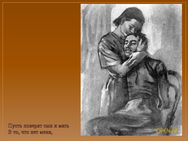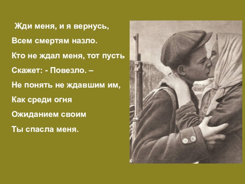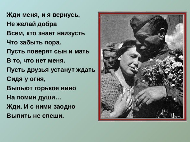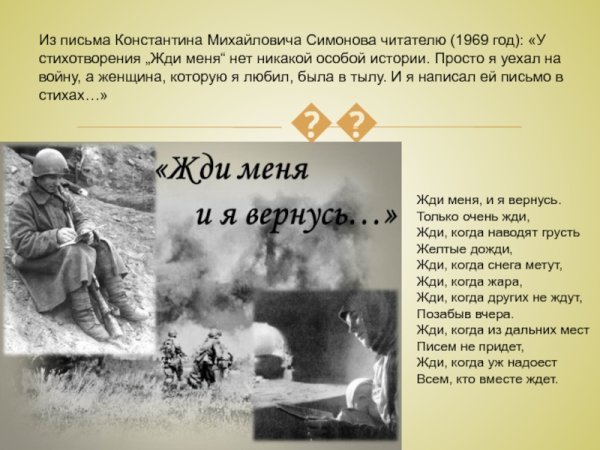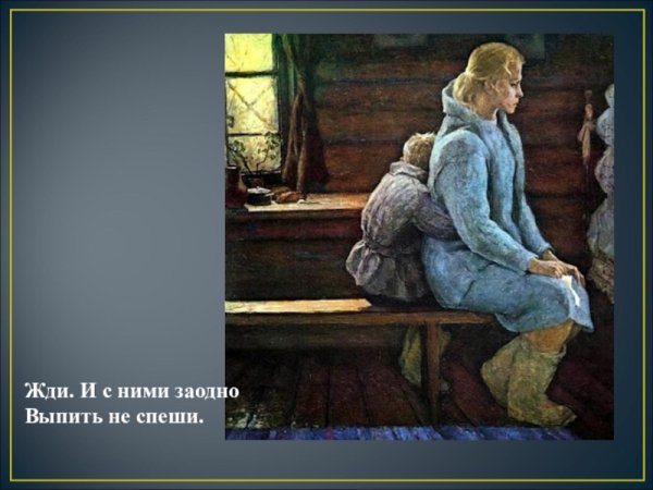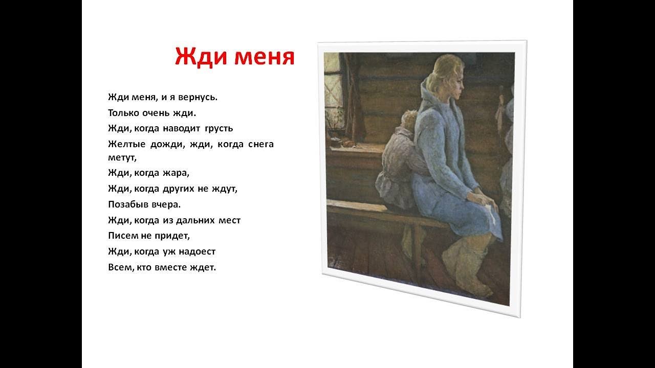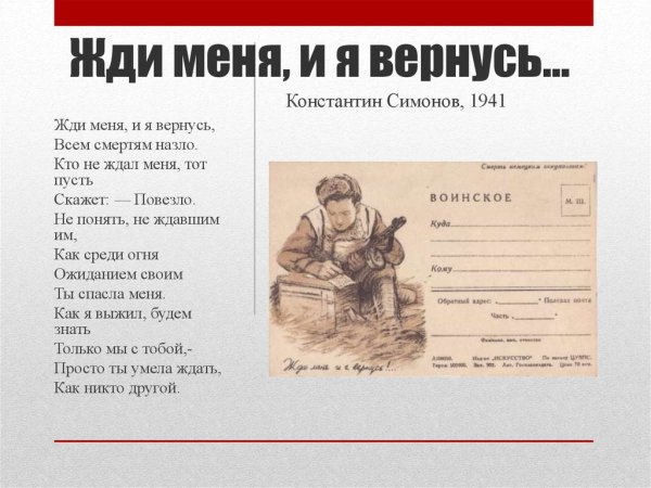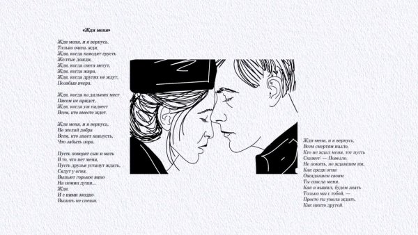 Иллюстрация к стихотворению "Жди меня" наполняет произведение тонкой эмоциональностью и романтическим настроением. Она передает главную идею стихотворения - верность и ожидание любимого человека. В иллюстрации может быть изображена женщина, смотрящая вдаль, с нежным выражением лица и предвкушением в глазах. Фон может быть выполнен в пастельных тонах, подчеркивающих романтическую атмосферу произведения. Эта иллюстрация вызывает трепет и умиление, заставляя читателя вжиться в образ героев и почувствовать всю глубину искренней любви и долгожданного возвращения.
