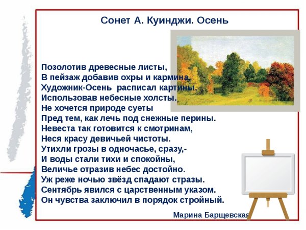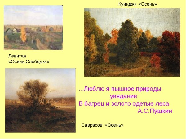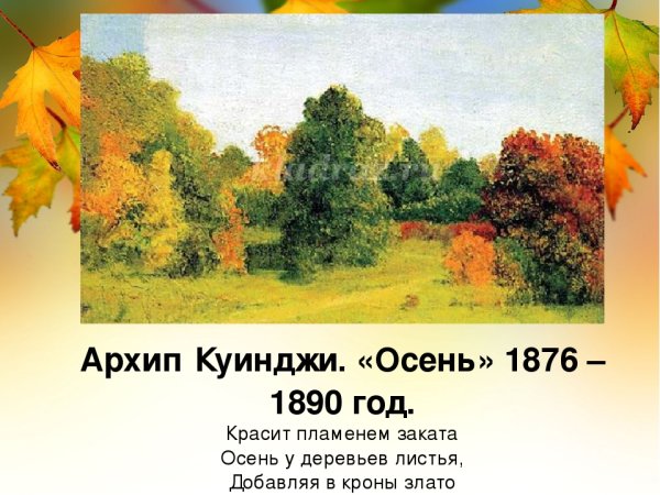 Иллюстрация к стихотворению "Осень" Куинджи – это великолепное произведение искусства, которое прекрасно передает атмосферу и настроение осеннего времени года. В нем художник передает всю красоту и многогранность осенней природы: золотые оттенки листвы на деревьях, тонкие лучи солнца, проникающие сквозь плотную листву, и легкий ветер, играющий с опавшими листьями. Каждая деталь и цветовая гамма иллюстрации передают особый шарм и очарование этого времени года. Через свой уникальный стиль и технику, Куинджи создает неповторимую атмосферу осени, наполняя ее теплотой и умиротворением. Иллюстрация к стихотворению "Осень" Куинджи – это настоящее произведение искусства, которое поражает своей красотой и вызывает у зрителя ощущение глубокой гармонии с природой.