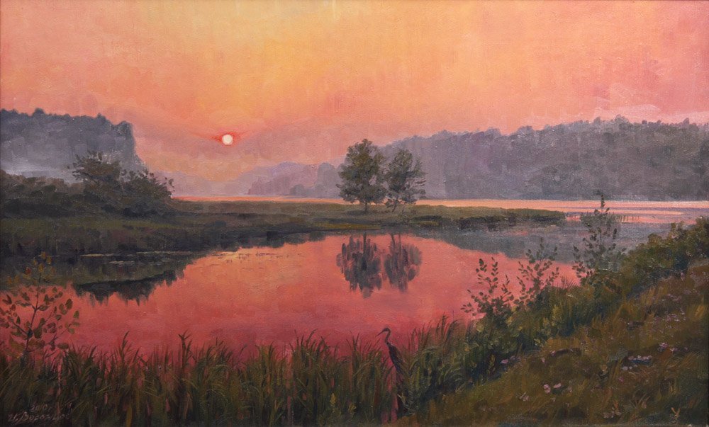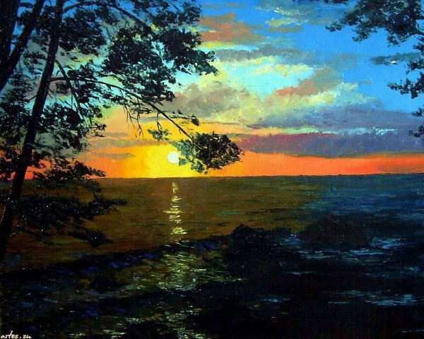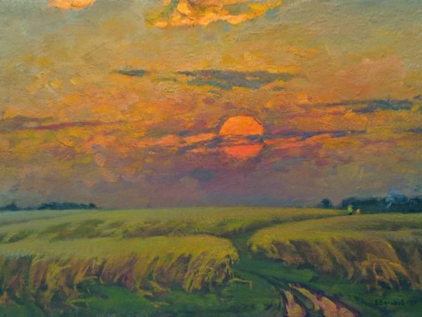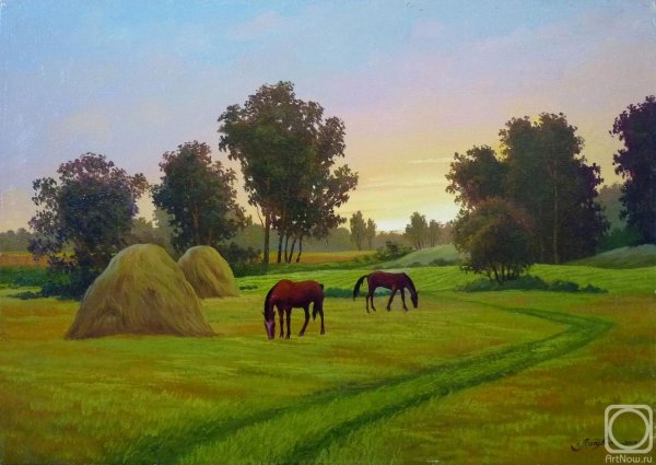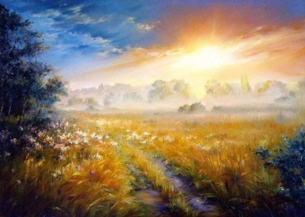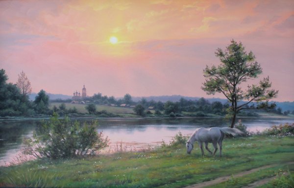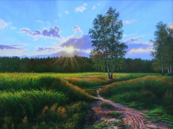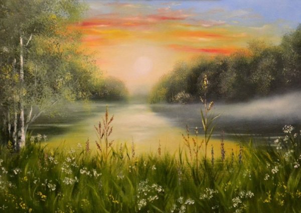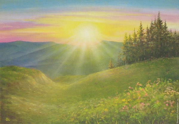 Иллюстрация к стихотворению "Летний вечер" передает атмосферу теплого и умиротворенного летнего дня. Разнообразие ярких цветов, отраженных на холсте, создает ощущение живой природы и привлекает взгляд зрителя. В центре композиции изображена пейзажная сцена: зеленые поля и луга, розово-оранжевое небо, наполненное последними лучами заката, и река, извивающаяся среди деревьев. Вдали виднеются горы, их силуэты теряются в бесконечности горизонта. Воздушные акварельные штрихи придают работе легкость и нежность, словно переносит зрителя в мир гармонии и покоя. Иллюстрация к стихотворению "Летний вечер" выразительно передает эмоциональную составляющую произведения, призывая нас насладиться красотой окружающего мира и прочувствовать его волшебство.