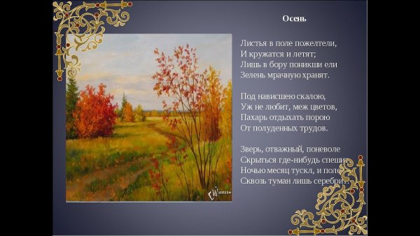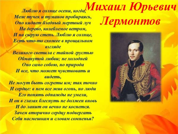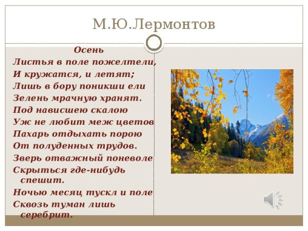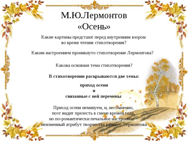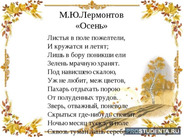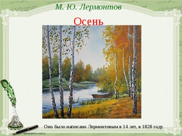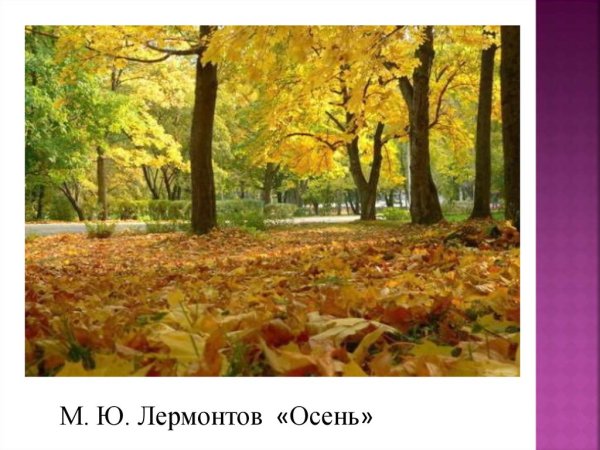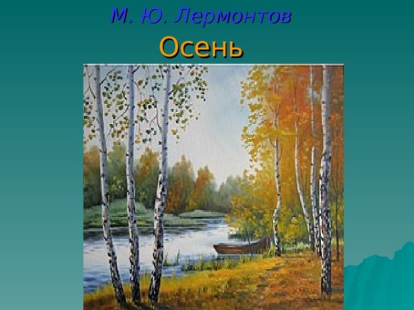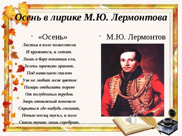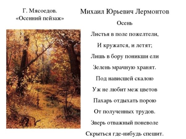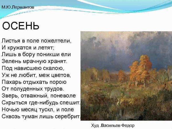Иллюстрация к стихотворению "Осень" Михаила Юрьевича Лермонтова — это визуальное произведение, которое передает настроение и образы, описанные в поэтическом тексте. В этом стихотворении Лермонтов передает осеннюю меланхолию, тоску и уходящую красоту природы. Иллюстрация может показывать осенний пейзаж с его характерными чертами: опавшие листья, желтые и красные оттенки деревьев, серый небосвод и туманную атмосферу. Такая иллюстрация поможет читателю лучше погрузиться в атмосферу стихотворения и воспринять эмоциональное состояние, вызванное словами Лермонтова.