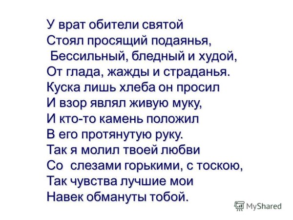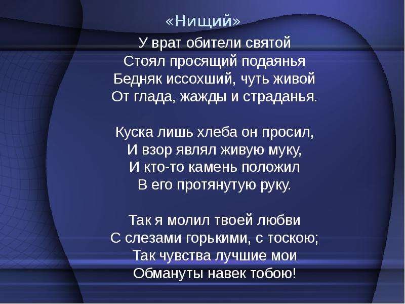 Иллюстрация к стихотворению "Нищий" Лермонтова - это уникальное произведение искусства, которое воплощает глубокий символический смысл и эмоциональную напряженность самого произведения. Возможно, на иллюстрации будет изображен нищий, бродящий по улицам города, его одежда повислая и потрепанная, выражение лица отражающее грусть и отчаяние. Такая картинка позволяет зрителю визуально ощутить состояние души главного героя стихотворения, его социальное положение и внутренний мир. Она вызывает сильные эмоции, заставляет задуматься о проблемах бедности и неравенства в обществе, а также о вечных вопросах смысла жизни и человеческого существования. В целом, иллюстрация к стихотворению "Нищий" Лермонтова является неотъемлемой частью его интерпретации и способна вдохновить зрителя на глубокие размышления о человеческой судьбе и социальной справедливости.