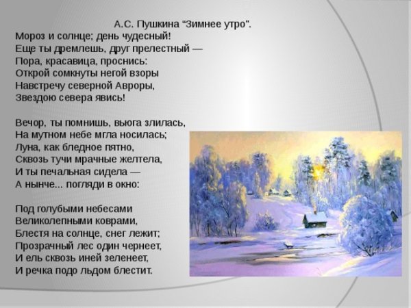 Зимнее утро - это знаменитое стихотворение Александра Пушкина, которое переносит нас в прекрасную зимнюю сказку. Каждая строчка этого произведения наполнена магией и красотой зимней природы. Читая эти строки, мы можем представить себе застывшие реки, снежные поля и леса, покрытые белым пухом. Иллюстрация к этому стихотворению поможет нам еще глубже погрузиться в атмосферу зимнего утра, передавая нам ту уникальную атмосферу, которую создает Пушкин своими словами. Она может быть как художественным изображением снежных пейзажей, так и детальным портретом главного героя стихотворения. Вместе с этой иллюстрацией мы можем полностью ощутить всю красоту и волшебство зимнего утра, затягиваясь каждым словом и каждым изображением.
